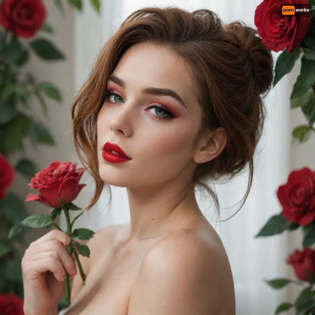 The image depicts a beautiful woman with striking makeup and an elegant hairstyle holding a vibrant red rose near her face. Her makeup includes defined eyebrows, smoky eyeshadow with a winged eyeliner, lush eyelashes, and glossy red lipstick. Her hair is styled upwards, showcasing its brown and auburn tones. The red rose is prominently displayed in the foreground, creating a striking contrast with the woman's fair complexion and drawing attention to her features. The background is a bright white, enhancing the visual impact of the subject and rose. The image depicts a beautiful woman with striking makeup and an elegant hairstyle holding a vibrant red rose near her face. Her makeup includes defined eyebrows, smoky eyeshadow with a winged eyeliner, lush eyelashes, and glossy red lipstick. Her hair is styled upwards, showcasing its brown and auburn tones. The red rose is prominently displayed in the foreground, creating a striking contrast with the woman's fair complexion and drawing attention to her features. The background is a bright white, enhancing the visual impact of the subject and rose.