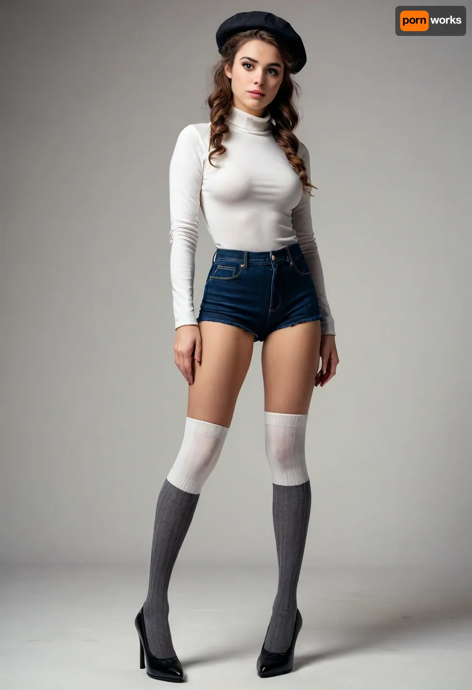 18 century, full body view of a 29 years old adult woman, dressed in knee-high socks and high heels, ultra-sharp details, realistic skin texture, refined contrast, 8k detail, authentic facial expression, clean composition, (maximum photo quality:1.4), (maximum resolution:1.5), white background