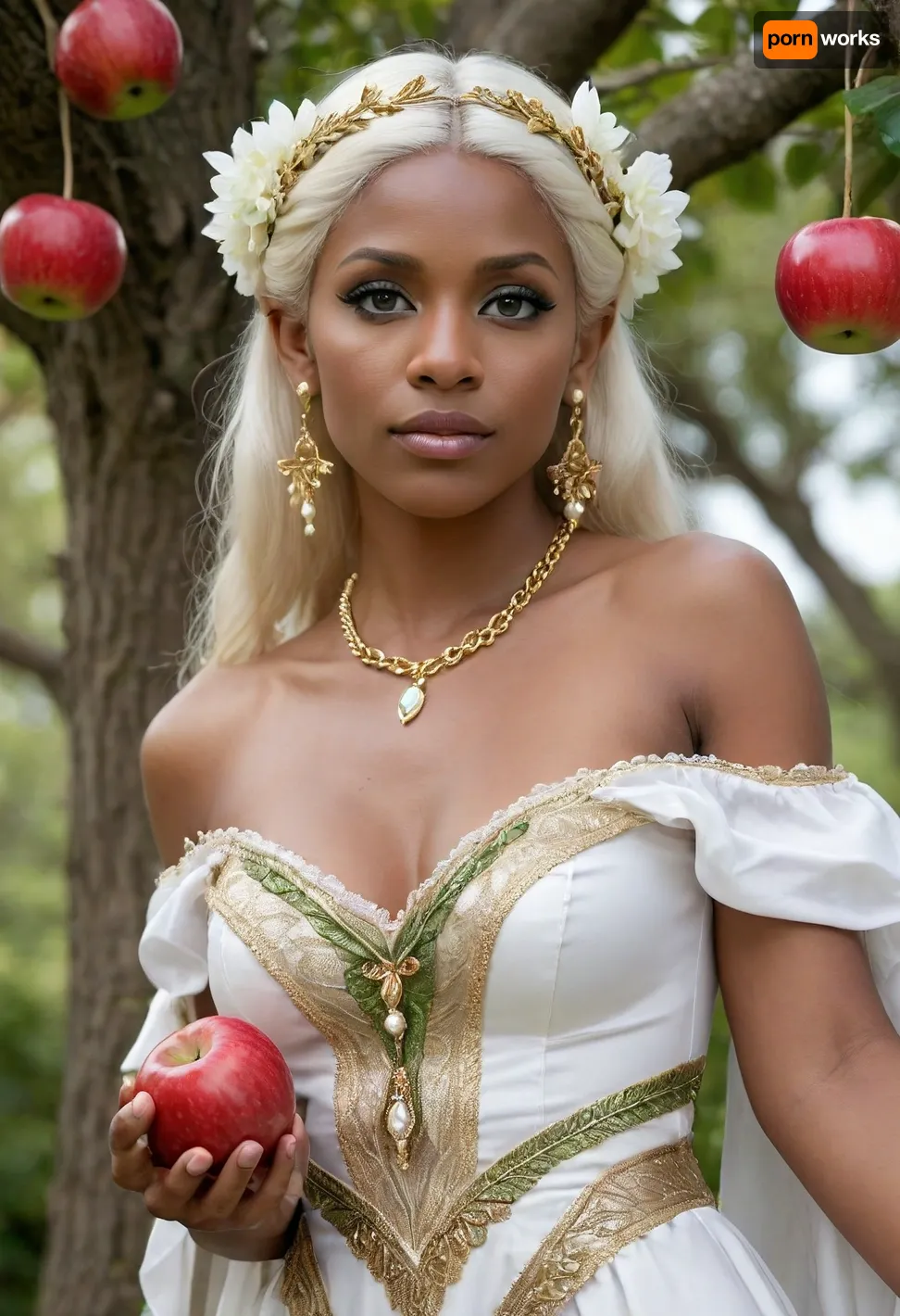 Elf woman, milf, long flowing platinum blonde hair, pointed elf ears, white flowers in her hair, gold headpiece on her forehead, dark skin, white tribal tattoos on her arms and shoulders, blue eyes, small nose, full lips, slightly open-mouthed expression, large pearl earrings, pearl necklace with gold accents, form-fitting elegant white off-shoulder dress with ornate gold and pearl embellishments and a red ruffled underskirt, dark green sash with gold patterns and hanging tassels tied around her waist, She is reaching up to pick a red apple from a tree, confident/serene demeanor, outdoors, fantasy setting Elf woman, milf, long flowing platinum blonde hair, pointed elf ears, white flowers in her hair, gold headpiece on her forehead, dark skin, white tribal tattoos on her arms and shoulders, blue eyes, small nose, full lips, slightly open-mouthed expression, large pearl earrings, pearl necklace with gold accents, form-fitting elegant white off-shoulder dress with ornate gold and pearl embellishments and a red ruffled underskirt, dark green sash with gold patterns and hanging tassels tied around her waist, She is reaching up to pick a red apple from a tree, confident/serene demeanor, outdoors, fantasy setting
