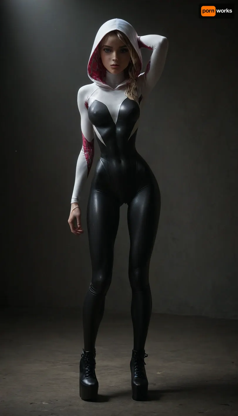 (((18 years old))), (((young))), (spider girl Gwen Stacy), Braided side Side Cornrows white Hair, (seductive shy face), (full body view:1.3), (clubfoot:1.3), ((tied high platform boot)), (seductive sexy pose:1.3), ((tight outfit)), (athletic body:1.5), (athletic abs and legs:1.1), (hip gap:1.3), wide hips, (narrow waist:1.6), (white hair), (view from front:1.6), standing into the office, (makeup), ((pussy cameltoe:1.4)), (wet oiled clothes), (makeup:1.4), (oiled skin:1.7), ((wet tight bodysuit:2)), hand, 1girl, (athletic ass), (high detailed face:1.5), dim lights, (hard nipples:1.3), (big perky boobs:1.1), (chiaroscuro lighting:.3), <lora:HandFineTuning_XL:1>, <lora:MGLRbodysuit_sdxl:.6>, <lora:uberfit_lora_sdxl:.4>, <lora:dark:.3>, <lora:M0llY_PARK3R-000001:.8> (((18 years old))), (((young))), (spider girl Gwen Stacy), Braided side Side Cornrows white Hair, (seductive shy face), (full body view:1.3), (clubfoot:1.3), ((tied high platform boot)), (seductive sexy pose:1.3), ((tight outfit)), (athletic body:1.5), (athletic abs and legs:1.1), (hip gap:1.3), wide hips, (narrow waist:1.6), (white hair), (view from front:1.6), standing into the office, (makeup), ((pussy cameltoe:1.4)), (wet oiled clothes), (makeup:1.4), (oiled skin:1.7), ((wet tight bodysuit:2)), hand, 1girl, (athletic ass), (high detailed face:1.5), dim lights, (hard nipples:1.3), (big perky boobs:1.1), (chiaroscuro lighting:.3), <lora:HandFineTuning_XL:1>, <lora:MGLRbodysuit_sdxl:.6>, <lora:uberfit_lora_sdxl:.4>, <lora:dark:.3>, <lora:M0llY_PARK3R-000001:.8>