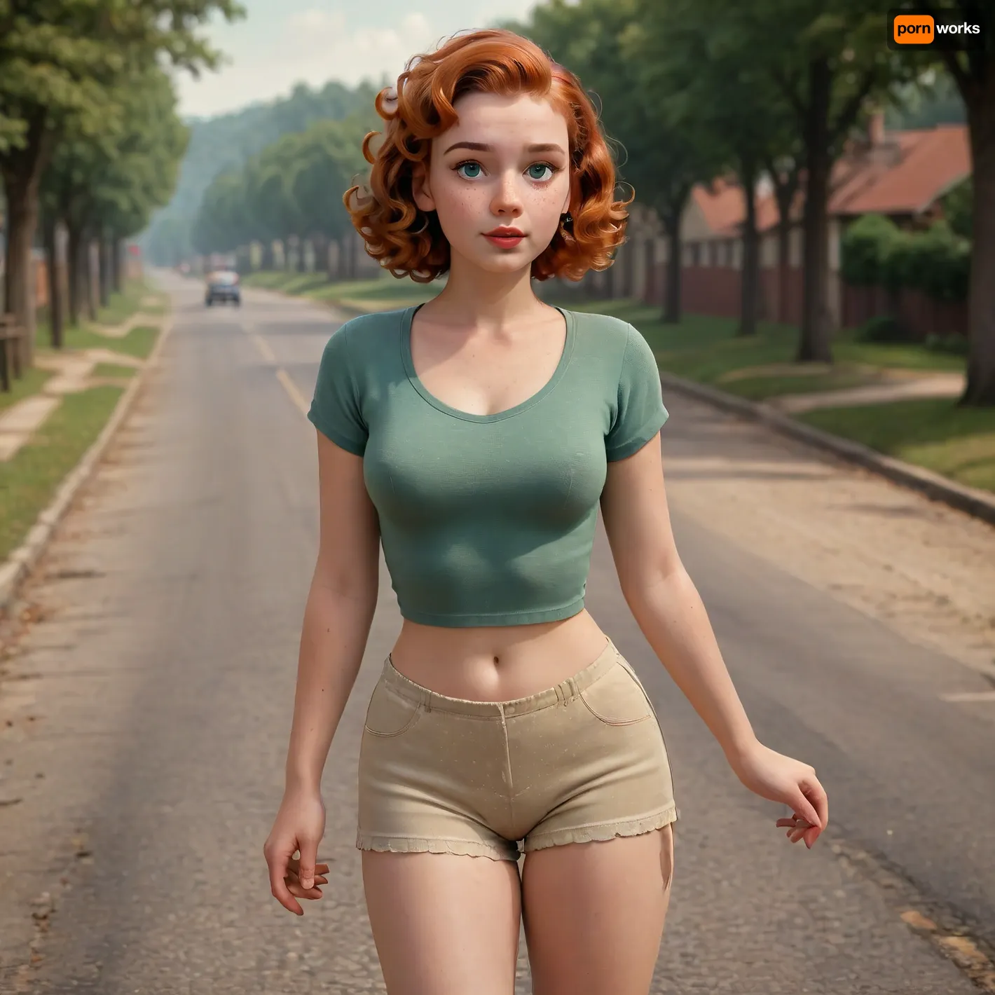Young, Girl, chubby, cute, skin spots, acnes, skin blemishes, long neck, nearsighted, wild ginger hair, natural light red hair, radiant green eyes, freckles, pale skin, shot on 35mm, ultra high resolution, 8k, ultra realistic, photorealistic, beautiful, studio lighting, photon mapping, radiused, physics based rendering, ((bob haircut with large curls), red shoes, very attractive hitchhiker standing by the road, legs wide apart, hands by head, realistic nipples, realistic pussy, realistic anus, realistic anatomy, realistic pose, front view, (1950s/1960s vintage color photograph:1.7), taken with Kodak, 35mm film, 16mm lens, grainy, real, (best quality, ultra-detailed, fine detail, highres, 8k wallpaper:.5)), <lora:princess_xl_v2:.5>