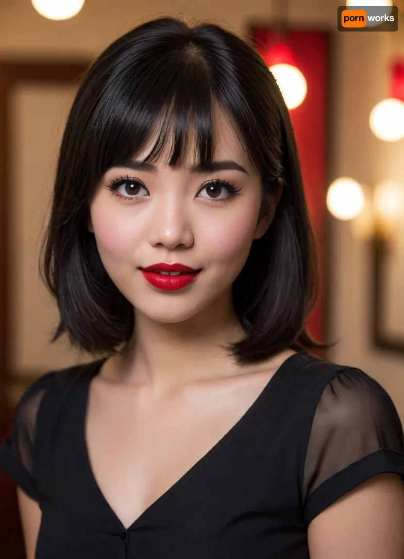 (Asian woman:1.2), (age 20-25:1.1), centered, smiling, (detailed facial features:1.3), black hair with bangs, (detailed black shirt:1.2), (bright red lipstick:1.3), warm lighting, indoor shot, looking directly at the camera, (close-up shot:1.2), (detailed skin:1.2), neutral expression, simple background, soft focus, natural skin texture, digital art, photorealistic, depth of field (Asian woman:1.2), (age 20-25:1.1), centered, smiling, (detailed facial features:1.3), black hair with bangs, (detailed black shirt:1.2), (bright red lipstick:1.3), warm lighting, indoor shot, looking directly at the camera, (close-up shot:1.2), (detailed skin:1.2), neutral expression, simple background, soft focus, natural skin texture, digital art, photorealistic, depth of field