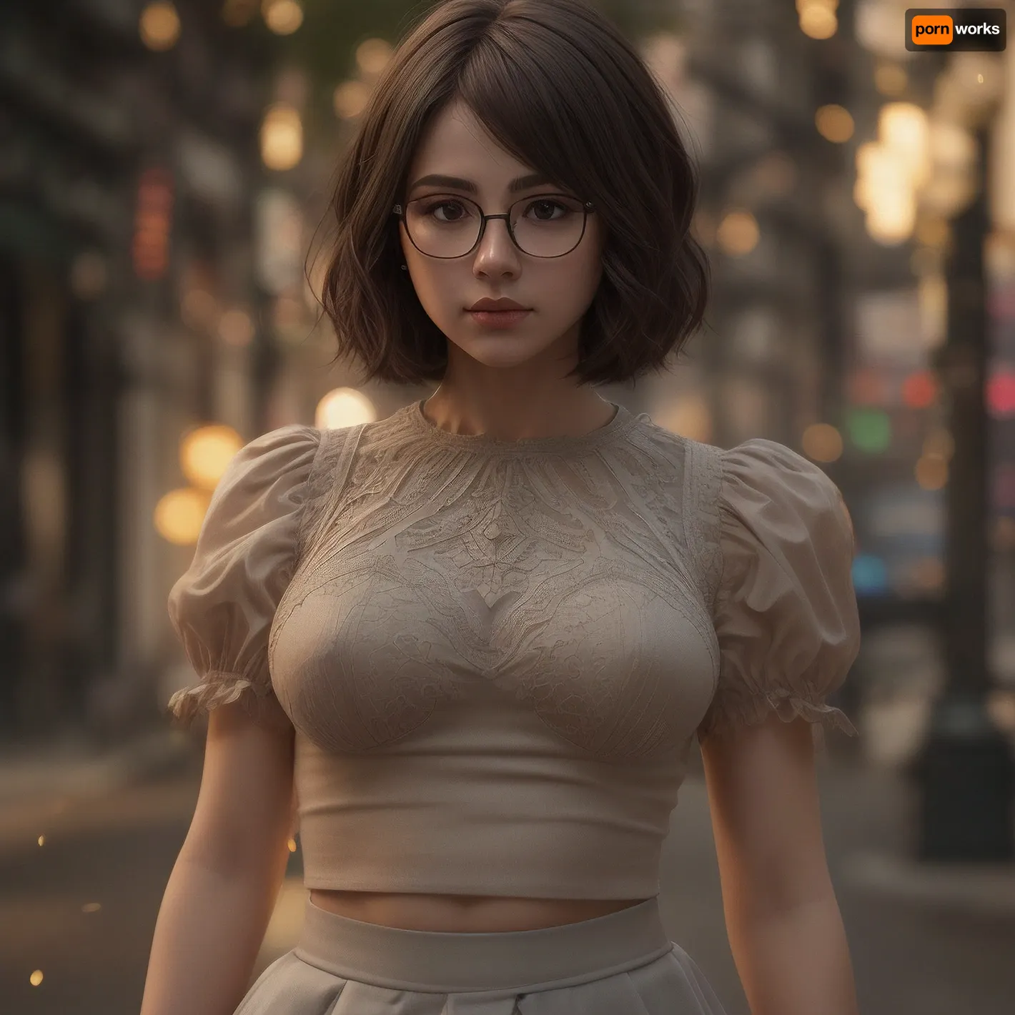 1girl Europian girl, looking at viewer, Full body view, 3D, realistic, a small delicate nose, soft rounded facial features, (but not chubby), (large breasts), (tight cropped top), (deep neckline), short gray skirt, brown natural hair, Warm eyes behind delicate glasses, messy shaggy Bob haircut, ((erect nipples visible through clothing)), masterpiece, best quality, 8k, detailed skin texture, detailed cloth texture, beautiful detailed face, intricate details, ultra detailed, rim lighting, side lighting, cinematic light, ultra high res, 8k uhd, film grain, best shadow, delicate, RAW 1girl Europian girl, looking at viewer, Full body view, 3D, realistic, a small delicate nose, soft rounded facial features, (but not chubby), (large breasts), (tight cropped top), (deep neckline), short gray skirt, brown natural hair, Warm eyes behind delicate glasses, messy shaggy Bob haircut, ((erect nipples visible through clothing)), masterpiece, best quality, 8k, detailed skin texture, detailed cloth texture, beautiful detailed face, intricate details, ultra detailed, rim lighting, side lighting, cinematic light, ultra high res, 8k uhd, film grain, best shadow, delicate, RAW