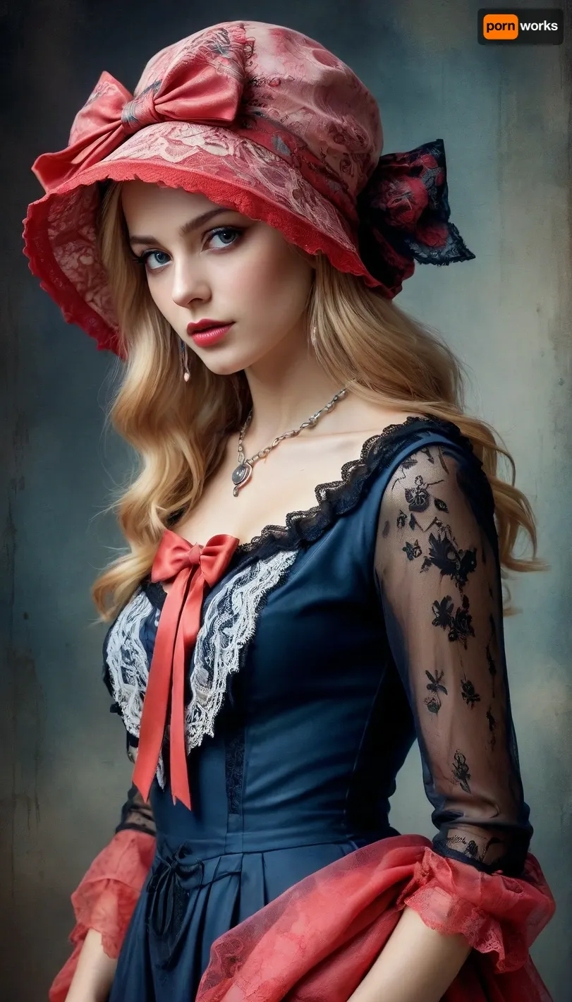 8k, RGB, HDR, oil paints, watercolors, bright saturated colors, Anna Razumovskaya, Jarek Kubicki, Aleksi Brilo, Darek Zabrotsky, Sakimichan, Loisch, Aminola Rezai, photo RAW, black, dark red, Mixed media collage., beautiful face. Calligraphy, gouache wash, pen sketch, thin lines, vintage illustration style. Black, white, coral pink, red, blonde hair, beautiful patterns, ral-melting, whdbd, blue, dress, jewelry, necklace, bonnet, long, sleeves, bow, lace, trim, frills, pantyhose, <lora:ral-melting-sdxl:.5>, <lora:whdbd XL:.8>
