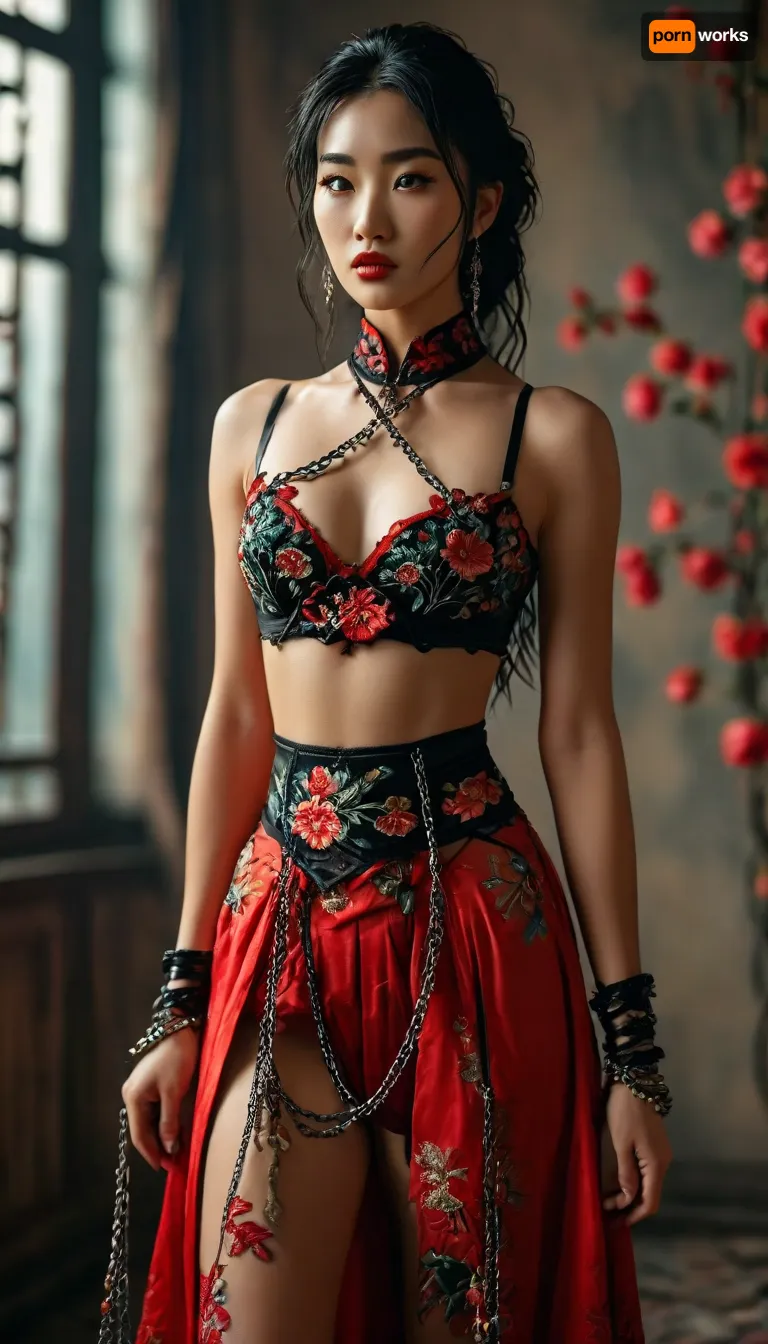 Mulan, <lora:MJ52:.8>, Garterbelt, black, fabric, floral, embroidery, wearing, the, garterbelt, iron, chains, <lora:GarterbeltXL:.8> Mulan, <lora:MJ52:.8>, Garterbelt, black, fabric, floral, embroidery, wearing, the, garterbelt, iron, chains, <lora:GarterbeltXL:.8>