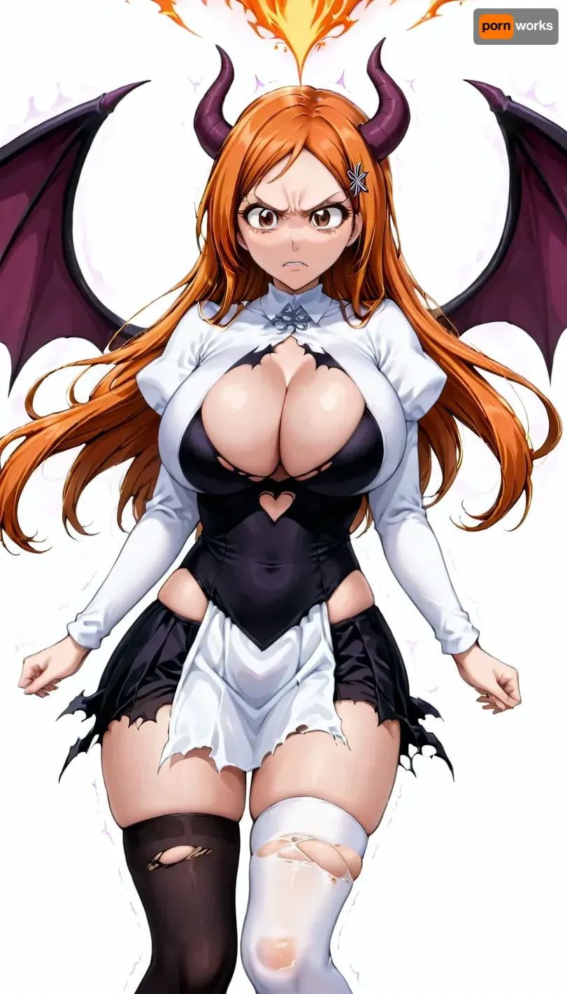 orihime inoue from bleach, long orange hair, hairpins, big breast, white background, body trembling, demon fusion, horns, wings, demonic aura, sexy clothes, angry, torn legwear, anime style, brown eyes, 1girl, orange, hair, ornament, cleavage, <lora:Inoue:.8>