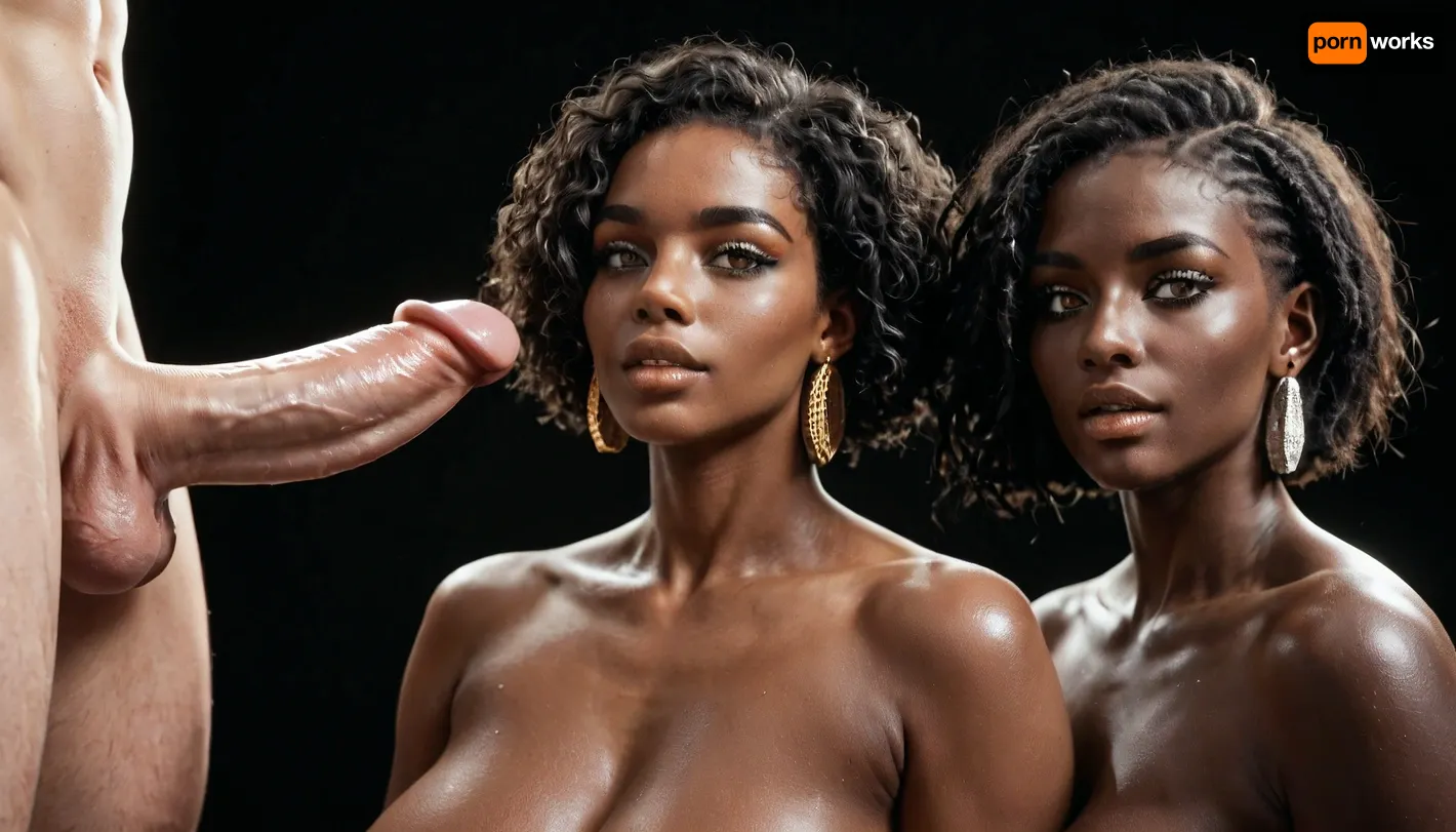 white man, short straight black hair, showing his huge 35 inch masive penis to two naked curvy black african women, his penis is very hard, erection. black room, black background. white man, short straight black hair, showing his huge 35 inch masive penis to two naked curvy black african women, his penis is very hard, erection. black room, black background.