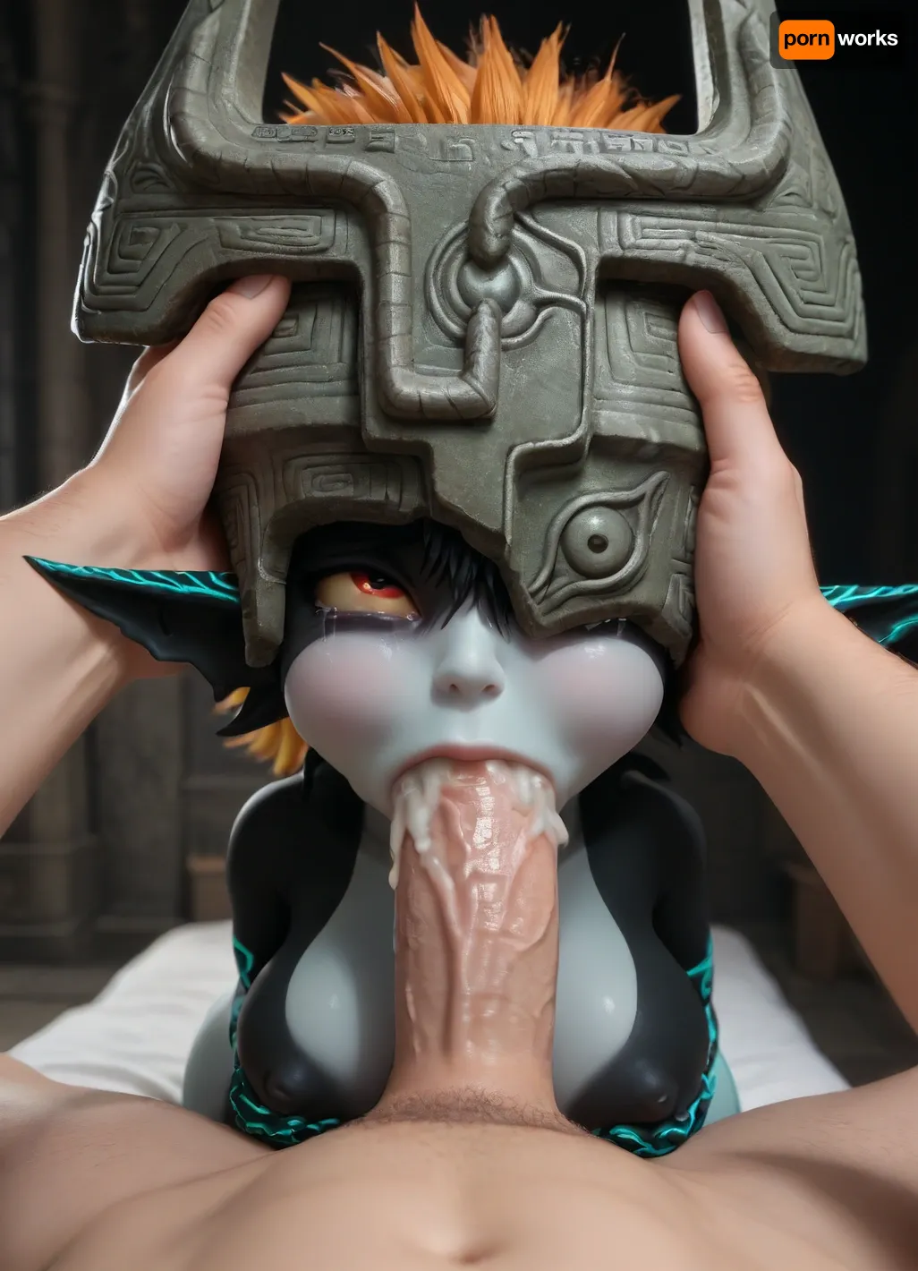 (Anime Imp midna), mask, black and grey skin, shortstack, big round breasts, breast expansion, big round ass, naked, deepthroating a 10 inch penis, ballsdeep, deepthroat, midna is grabbing male waist, male is grabbing midnas head, grabbing head with both hands, dark room, dark castle bedroom backround, on a bed, (ahegao face, orgasm face, eyes rolling back, hollow cheeks, crying), cum dripping out of nose, cum dripping out of mouth, cum exploding out of mouth, artist_name, <lora:illustrious_styles_v3_vpred:.8>, blowjob, <lora:SorasBlowjobs:.8>