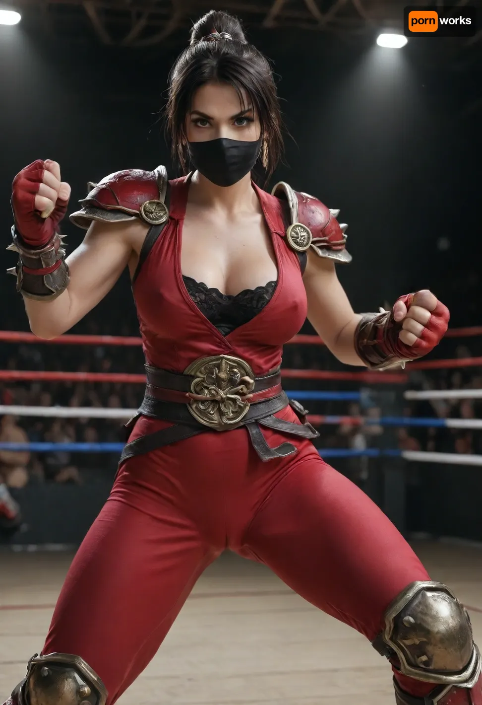 1girl, Taki, Soul Calibur, long dark hair tied back in a ponytail, (dark red face mask), very slender, sleeveless, very tight dark red bodysuit, bodysuit is very tight, (big cameltoe), cleavage, covered pointing nipples, fingerless gloves, spiked armored bracers, spiked knee guards, spiked shoulder pads, fists clenched, fight pose, legs spread, leaning angle, <lora:SDXL high detailed. LoRA_SDXL_ARW_0010:.8>, fight, stance, drunken, fist, high, kick, split, <lora:drunken-fist03:.8>, <lora:add-detail-xl:.8>
