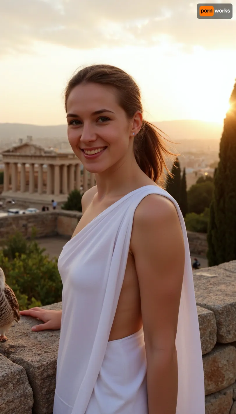 Sunset light, in Athena, Parthenon in background, greek woman, wearing a Greek tunic, wind, perfect composition, light smile, panoramic view, owl near woman