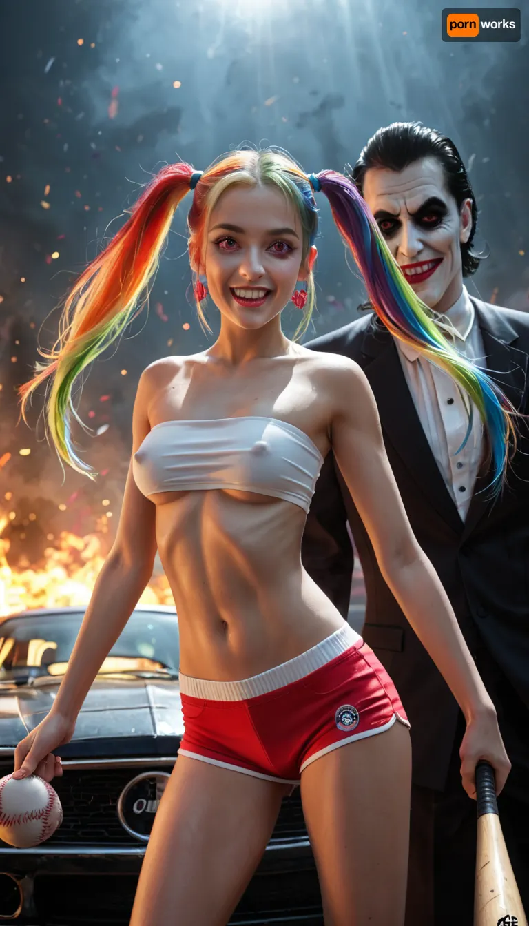 (1boy, ((Joker)), Jokerface, slim body, men's suit), //, 1girl, ((long rainbow colered hairs, high twintails hair)), (rainbow hotpants, tight bandeau top), sporty body, hourglass figure, perky ass, perky medium breasts, erect nipples, incredible legs//, hand in hand, both are crazy, baseball bats, wrecked cars, lots of damage, broken glass, fire, explosion, volumetric lighting, intricate details, perfect lighting, fine details, shot with a Leica M10 Summilux 50mm f/1.4, lifelike colors (1boy, ((Joker)), Jokerface, slim body, men's suit), //, 1girl, ((long rainbow colered hairs, high twintails hair)), (rainbow hotpants, tight bandeau top), sporty body, hourglass figure, perky ass, perky medium breasts, erect nipples, incredible legs//, hand in hand, both are crazy, baseball bats, wrecked cars, lots of damage, broken glass, fire, explosion, volumetric lighting, intricate details, perfect lighting, fine details, shot with a Leica M10 Summilux 50mm f/1.4, lifelike colors