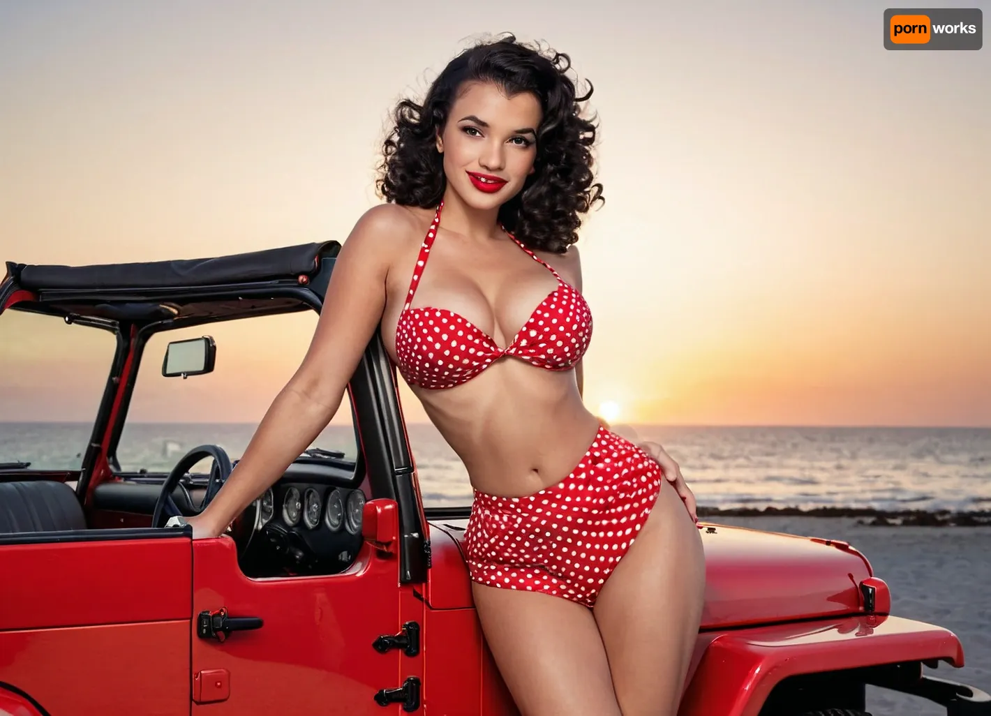 Caucasian woman, curvy body, tanned skin, tan lines, 1950s pinup, by the beach, black curly hair, (open top jeep wrangler), sunset, pin up, flirting, Pinup photo, voluptuous woman, cute smile, retro, red and white polka dot bikini, posing by car, 25 years old, beautiful pin up style, perfect lighting, retro lut, retro style, 4ng3l, face, <lora:SDXL_BetterFaces-LoRA_v1:.8>