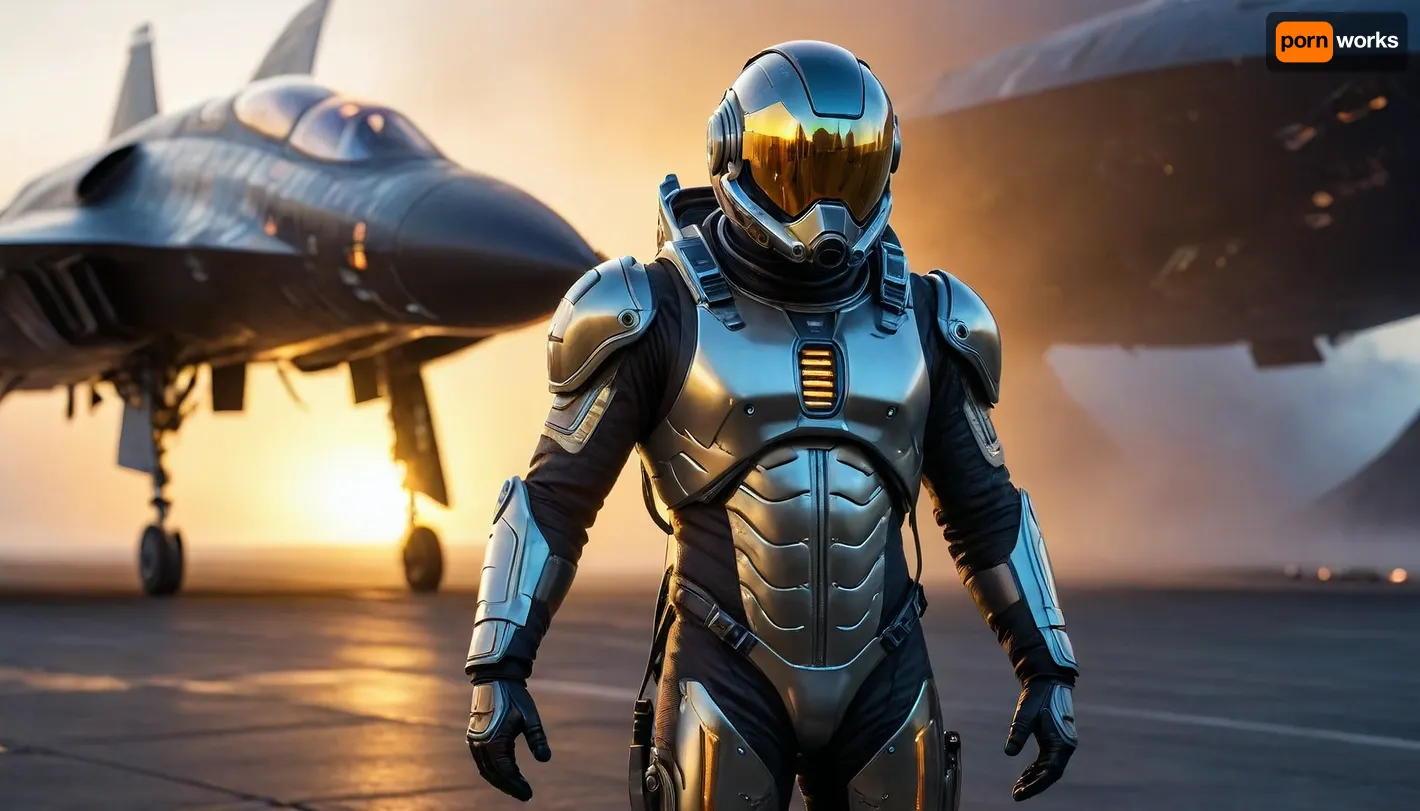 Epic futuristic male test pilot before first flight, intense badass expression, standing in front of SR-71 Blackbird at dramatic dawn with golden mist and rays. Advanced sci-fi pressure suit, high-tech helmet with glowing holographic HUD projections floating around head, integrated oxygen mask with long tube hanging down, anti-G suit with harness, integrated gloves boots, shifting holographic camouflage on suit. Cinematic sci-fi mood, hyperrealistic photorealistic ultra sharp detail glowing effects reflections, 8k --ar --v 5 --q 2 --stylize 650, holotech, <lora:Holotech:.8> Epic futuristic male test pilot before first flight, intense badass expression, standing in front of SR-71 Blackbird at dramatic dawn with golden mist and rays. Advanced sci-fi pressure suit, high-tech helmet with glowing holographic HUD projections floating around head, integrated oxygen mask with long tube hanging down, anti-G suit with harness, integrated gloves boots, shifting holographic camouflage on suit. Cinematic sci-fi mood, hyperrealistic photorealistic ultra sharp detail glowing effects reflections, 8k --ar --v 5 --q 2 --stylize 650, holotech, <lora:Holotech:.8>