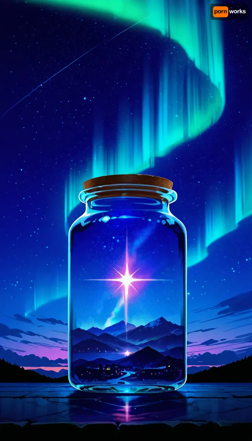 SK_Anime, (score_9, score_8_up, score_7_up), (northern lights, aurora, colorful night sky), mason jar