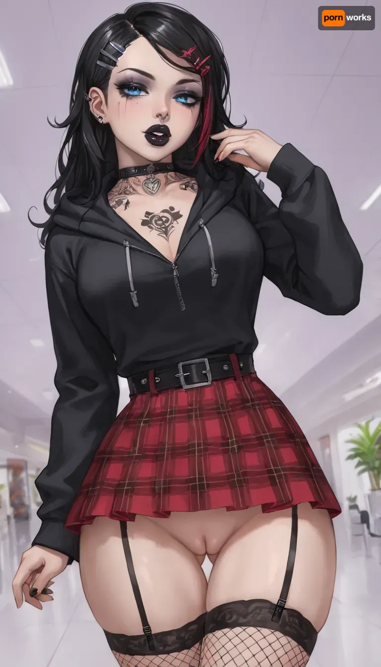 Tight asshole, pervy cute frisky emo girl, covered in tattoos, lots of tattoos, extremely horny, very attractive slutty hottie giving viewer peek of her tiny incredibly tight pussy, (huge anal plug:1), looking back at viewer with adorable extreme lewdness, beautiful face like a supermodel, glamorous goth makeup, black lipstick, (full thick lips:1.1), beautiful, gorgeous, perfect face, small cute nose, (blue perfect eyes), (large seductive eyes:1.3), (incredibly sexy physique:1.4), narrow shoulders and chest, narrow waist, perfect round ass, thigh gap, naturally busty, long straight black hair with highlights, (hair clip:1.4), (black hoodie:1.3), (red plaid skirt), (garter belt, fishnet stockings), (showing pussy:1.2), mall, TattooVariations, 3m0, Punk, G1rl, portrait, makeup, glowing, punk, 1girl, emo, girl, <lora:lora-sdxl-perfect-eyes:2>, <lora:TattooVariations:1.9>, <lora:Emo_Punk_Girl:1.2>, <lora:2010s_Emo_Style_XL:.6>, <lora:Buttplug__SDXL:1.8>