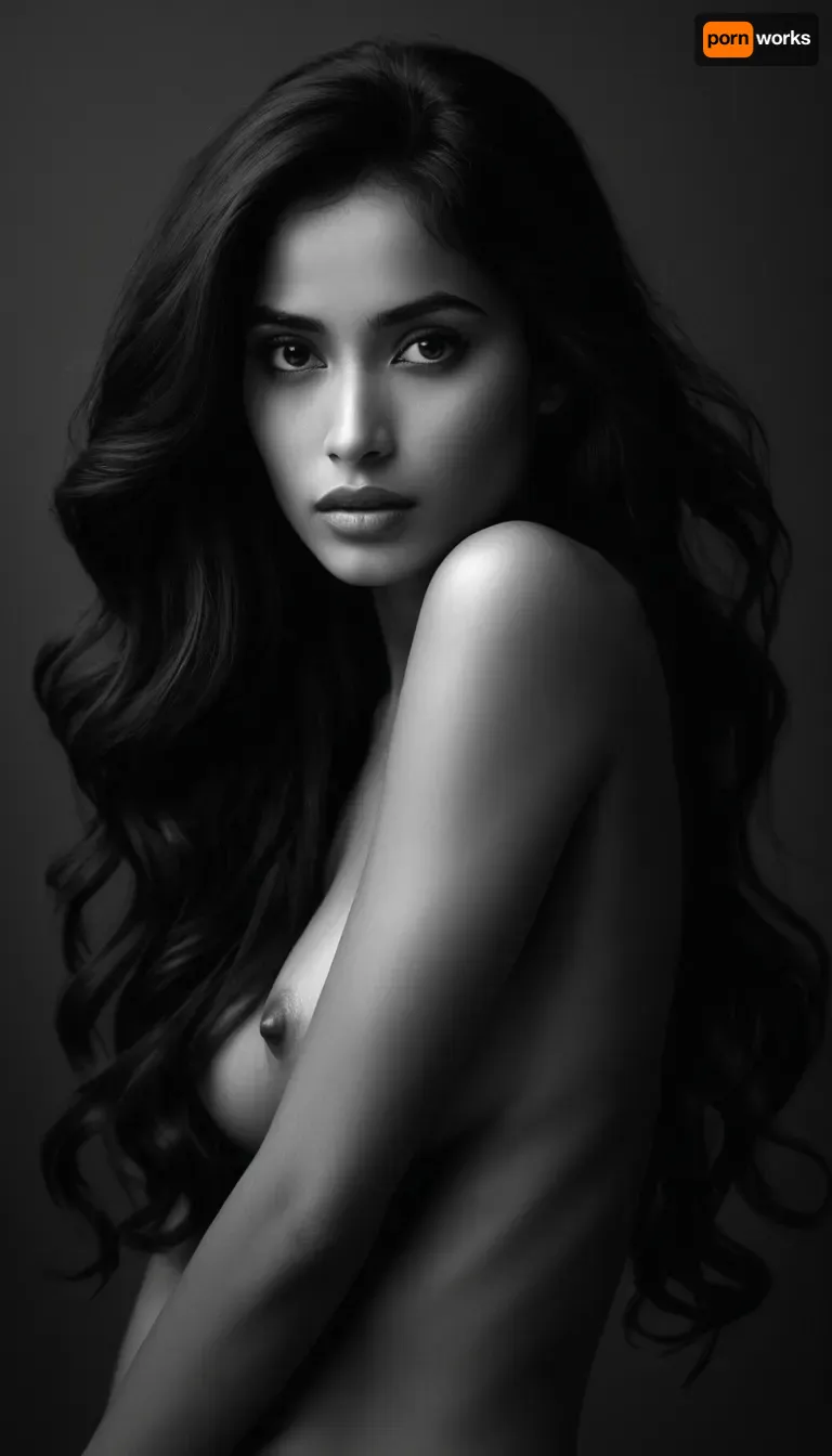 full body view of Pencil Tip, This black and white drawing is a surprisingly realistic pencil illustration. It depicts Princess Jasmine from the Disney animated film. Her long, dark, voluminous hair, styled in the iconic Disney style, is slightly disheveled, windswept and damp, adding a touch of natural vulnerability. The locks frame her face, rendered with soft shadows that emphasize her large eyes and delicate features. She wears a skimpy version of her traditional dress, barefoot., (((show the foot))), The fabric clings to her body, its texture is masterfully drawn, evoking the creased weight of wet silk. The dress, with its bare shoulders, reveals part of the collarbone and adds a subtle fragility to the scene. Her gaze is directed downwards and her expression is sorrowful, immersed in deep thought. The image is silent and full of emotion, the black and white tones accentuate the sense of loneliness and melancholy. Despite her sadness, her noble posture and graceful bearing suggest an inner strength.