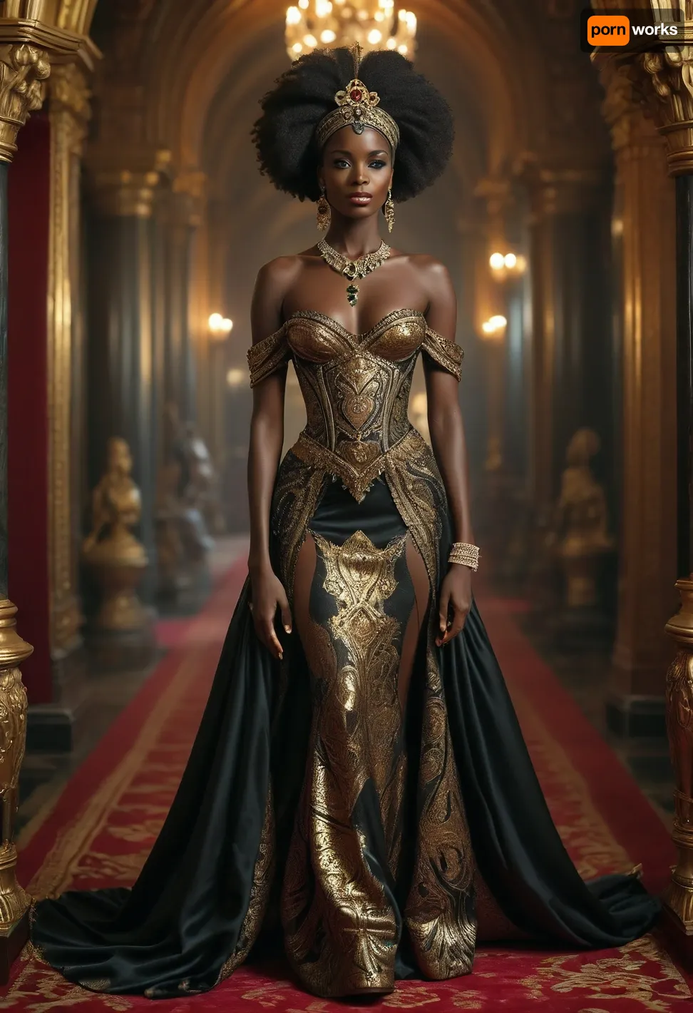 Create a highly detailed, realistic portrait of the Queen of Saba as she gracefully walks through her throne room. The Queen, (depicted as a Black African woman:1.5), exudes regal elegance and grandeur. She is adorned in an opulent dress, richly embellished with diamonds, rubies, and emeralds. Her attire should reflect immense wealth and royal status, with intricate gold detailing and luxurious fabrics. The diamonds should sparkle brilliantly against her dark skin, highlighting her regal presence. The scene should capture the elegance, wealth, and cultural richness of the royal court, focusing solely on the Queen’s majestic appearance and the splendor of her garments, breasts, massive, (maximum detail), (super realistic photo:1.4), <lora:MJ52:.6>, <lora:Super_Eye_Detailer_By_Stable_Yogi_SDPD0:.3>, <lora:BUT_SDXL_SHS:.3>, <lora:Sweaty_Realism_4-000006:.8>, <lora:Cloudy_Style:.8>