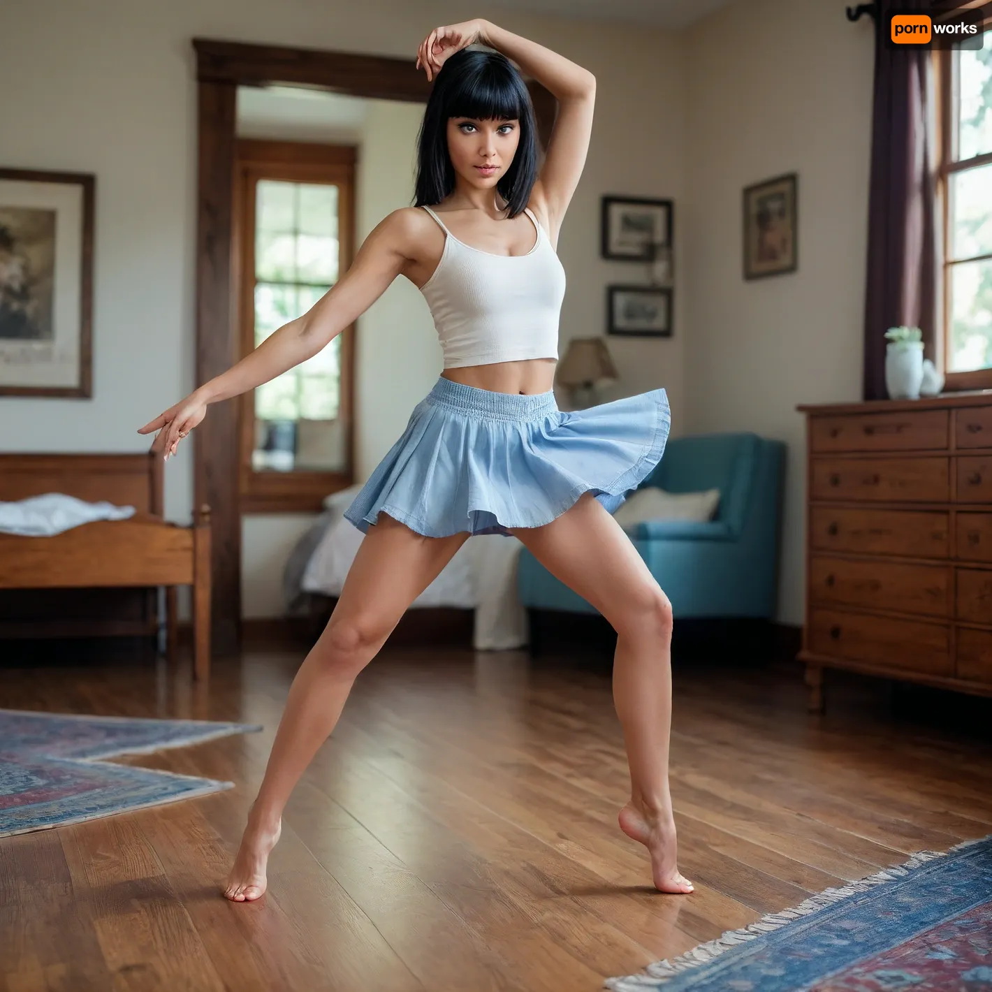 woman, dancing, bedroom, straight black bangs and blue eyes, tanned cutie, pedicure and wooden floor, semi-realism