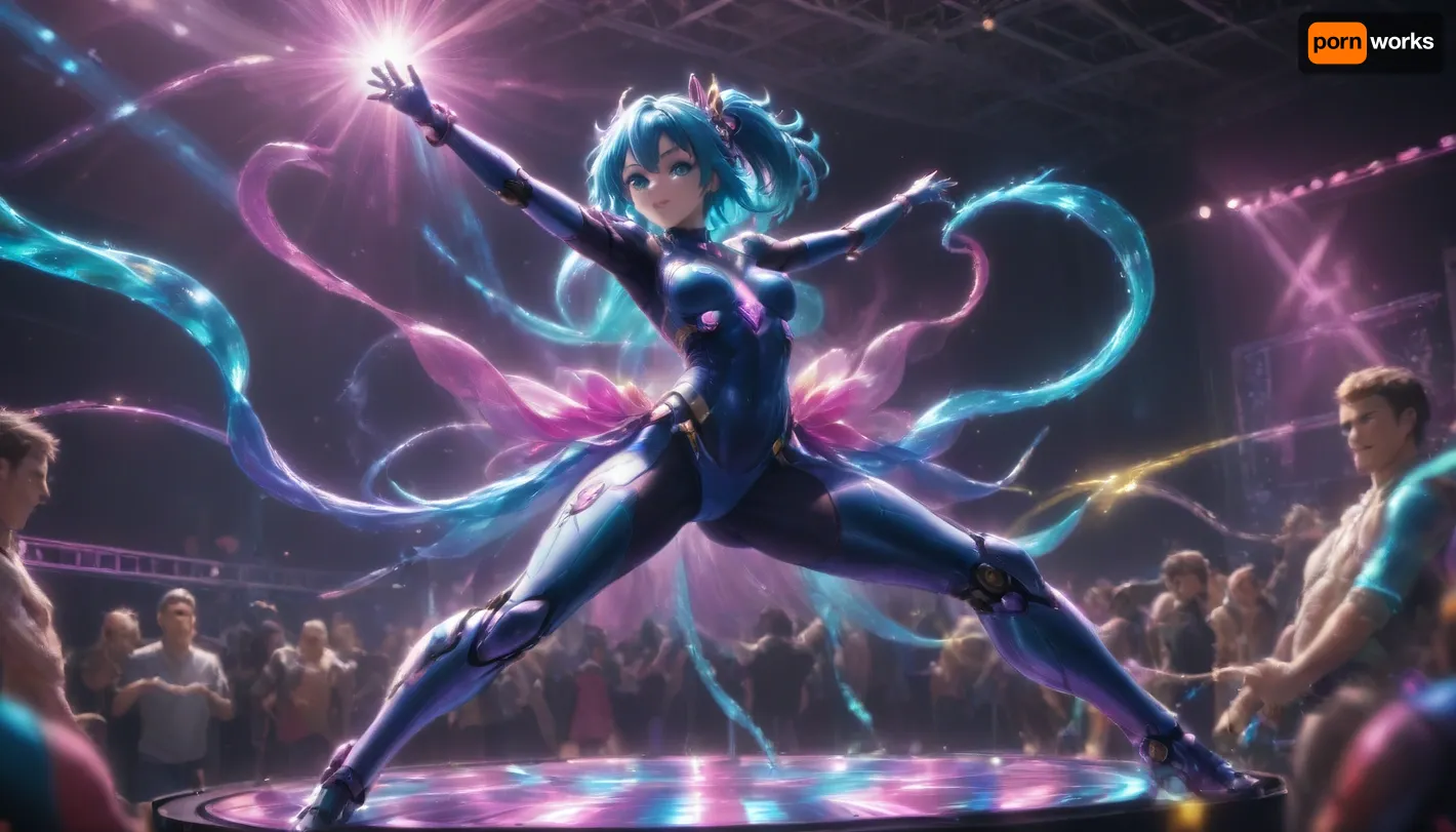 cyborg, blue hair, turquoise eyes, from the front, disco, dancing, party