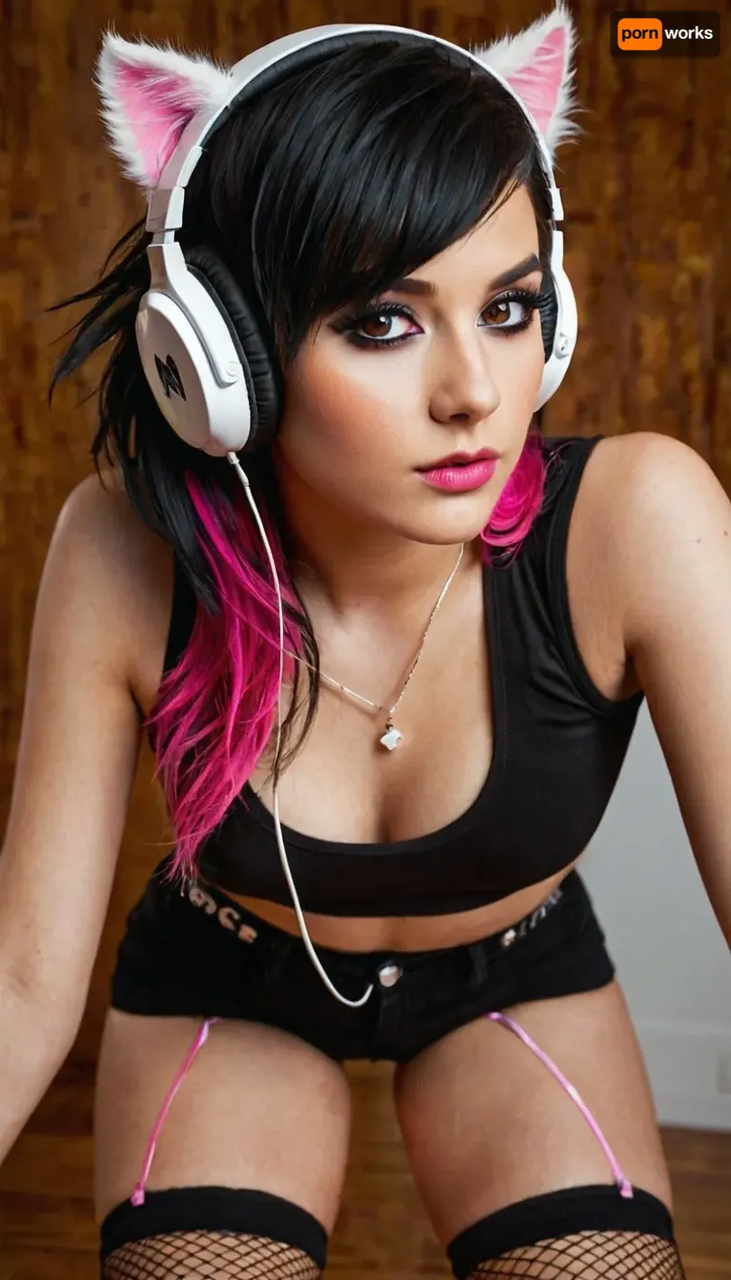 a vibrant 25-year-old gamer, exuded an irresistible blend of emo and e-girl aesthetics, a throwback to the MySpace era with a modern twist. Her petite frame was adorned in a playful ensemble, a cropped top that revealed a sliver of smooth skin, fishnet stockings that teased with glimpses of her toned legs, and white stockings peeking out from beneath a pair of short shorts. Her two-toned scene hair, a striking contrast of black and vibrant pink, framed a face expertly painted with dramatic scene makeup – smoky eyes, winged eyeliner, and a splash of bold color on her lips. A pair of cat-eared headphones, perched atop her head, completed the look, adding a touch of maximum cuteness to her already adorable appearance.