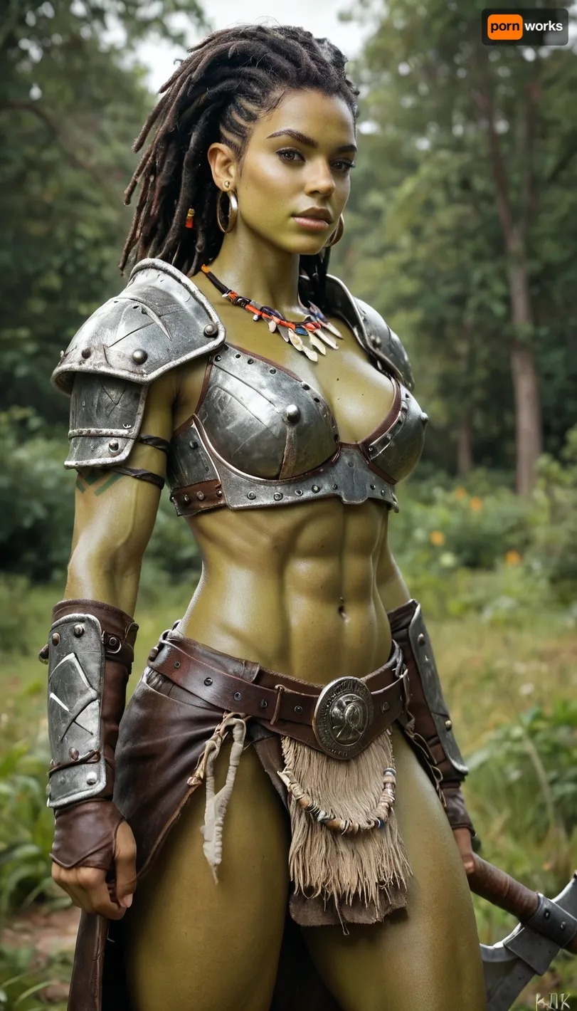 Realistic, 8k, detailed face, orc woman, warrior, green skin, tribal piercings, tribal markings, wearing iron armor, slutty armor, leather, medium perky breasts, slim waist, dreadlock hair, on a battlefield, carrying an axe, muscular body Realistic, 8k, detailed face, orc woman, warrior, green skin, tribal piercings, tribal markings, wearing iron armor, slutty armor, leather, medium perky breasts, slim waist, dreadlock hair, on a battlefield, carrying an axe, muscular body