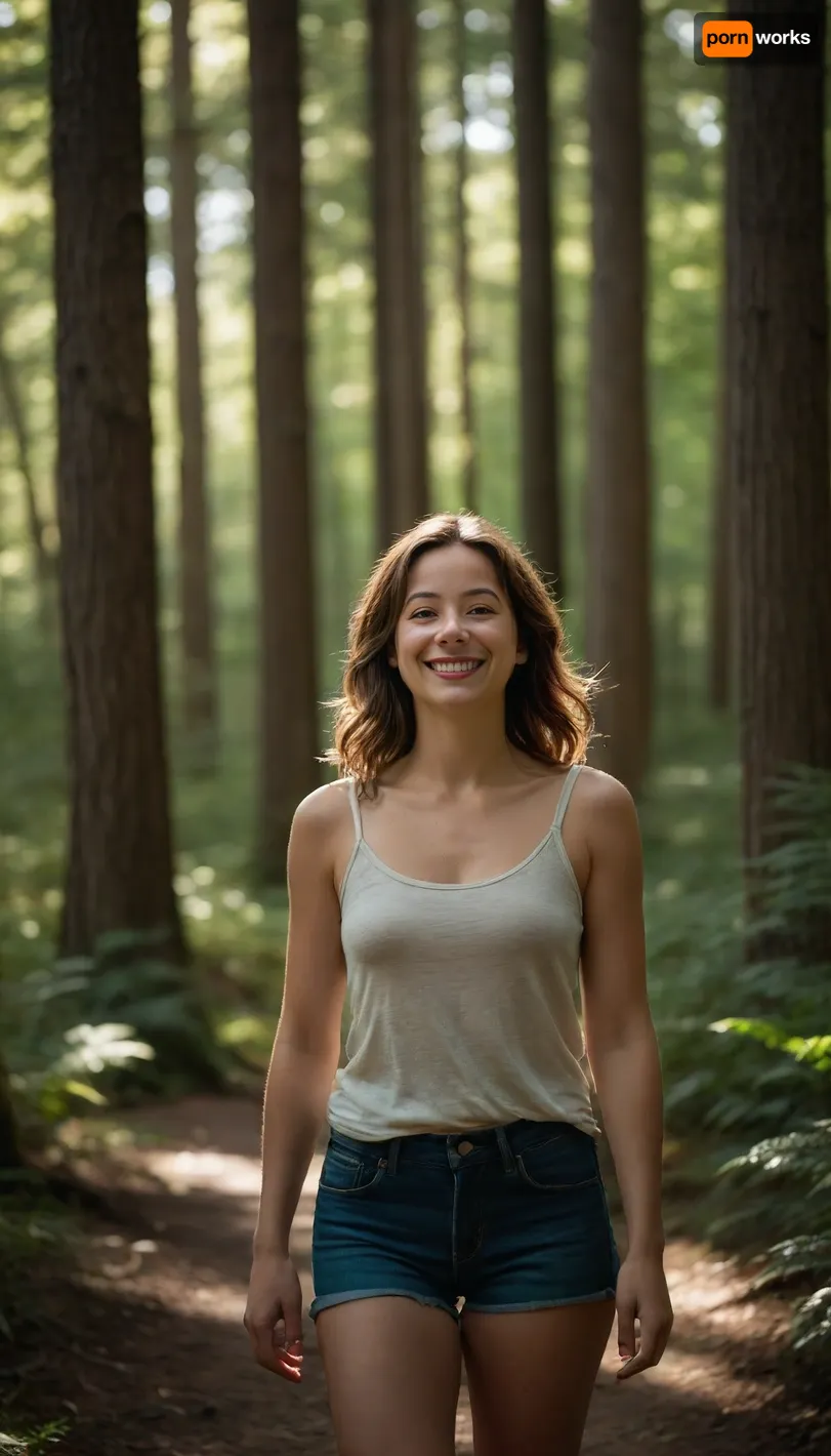 ((full body view)), A candid photograph of a woman in her mid-20s, with natural brown hair, walking through a sunlit forest. She is dressed casually in a summer shorty and a seethrough light tank top. The scene is illuminated by soft, natural light filtering through the trees, casting gentle shadows on her face. The focus is on capturing a realistic, spontaneous moment as she smiles while looking at the surrounding nature. The background is lush with green foliage and dappled sunlight, giving the image a serene, peaceful atmosphere, resembling a real-life photo taken with a high-quality camera.