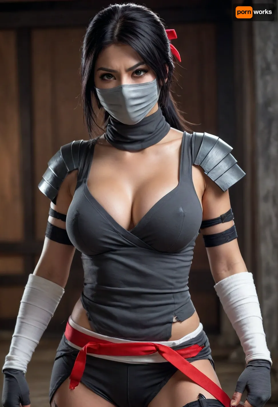 Kunoichi, dusty attic, sheathed katana, (wrapped white bandages on arms), ((tight-fitting dark gray ninja outfit with torn/ripped design)), ((large breasts)), gray fabric ninja mask, red ribbon in her black hair, (exaggerated features), determined/intense expression, (deep cleavage), mid-shot Kunoichi, dusty attic, sheathed katana, (wrapped white bandages on arms), ((tight-fitting dark gray ninja outfit with torn/ripped design)), ((large breasts)), gray fabric ninja mask, red ribbon in her black hair, (exaggerated features), determined/intense expression, (deep cleavage), mid-shot