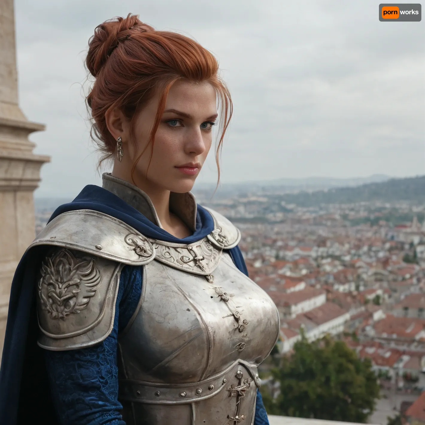 Aveline Vallen from Dragon Age II, tall and imposing warrior with a strong athletic build, fair skin, auburn hair tied back for battle, piercing blue eyes, expression stern but protective, large bimbo breasts. Wearing her iconic heavy armor, steel plate with red and silver detailing, cloak bearing Kirkwall’s crest. Standing proudly in a city courtyard or atop Kirkwall’s walls. Ultra-realistic high fantasy art, highly detailed, cinematic heroic atmosphere, commanding and noble presence. Aveline Vallen from Dragon Age II, tall and imposing warrior with a strong athletic build, fair skin, auburn hair tied back for battle, piercing blue eyes, expression stern but protective, large bimbo breasts. Wearing her iconic heavy armor, steel plate with red and silver detailing, cloak bearing Kirkwall’s crest. Standing proudly in a city courtyard or atop Kirkwall’s walls. Ultra-realistic high fantasy art, highly detailed, cinematic heroic atmosphere, commanding and noble presence.