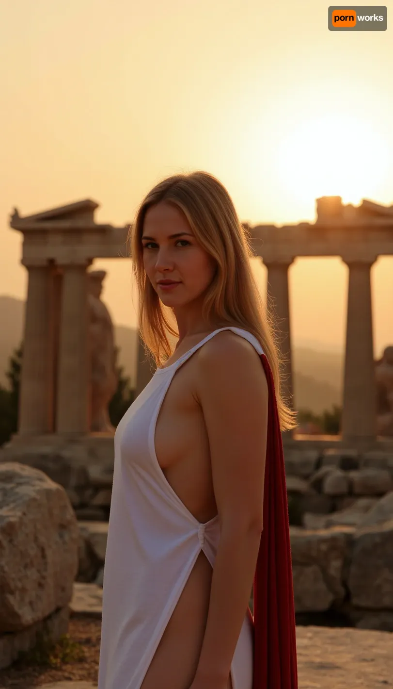 Sunset light, in Athena, before Parthenon, woman, blonde, near caryatide, wearing a Greek tunic, antiquity, spartan warrior
