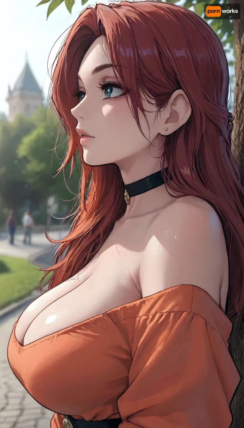 ((Melkor mancin meet markgavatino style)), reiq style, masterpiece, ((1woman, side view, 8k resolution, ultra-detailed, pale skin)), Redhead girl, long hair, wearing circle cleavage orange shirt, (giant round breasts), ((square defined jaw)), make up, at day, park and treed in background, detailed background, bust shot, 10° angle view, Sexy Girl, choker, (Shiny Skin), ratatatat74, <lora:LCMTurboMix_Euler_A_fix:1.1>, <lora:ratatatat74-000050:1.8>, <lora:mk_Bp Anime_xl:1.2>, <lora:焦茶_XL:2>, <lora:ayumasayu-XL-v1-ep60:1.9>