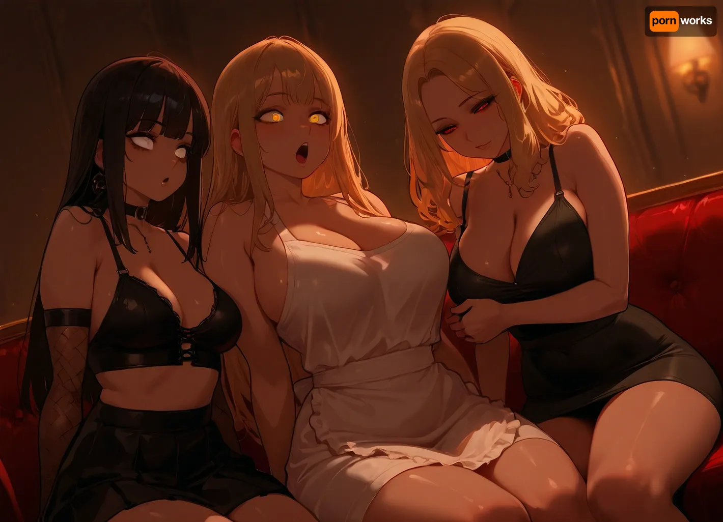 Three hypnotized girls on a sofa, the first girl is goth, the second woman is a MILF wearing a summer dress and an apron, and the third girl is wearing a skimpy club outfit with a crop top and a skirt. Straight rigid sitting position, realistic proportions, open mouth, empty white eyes, hypnosis, mind controlled, brainwashed, daylight, saturated, living room, (Three women:1.2), fully covered chest, white, sclera, eyes, glowing, <lora:white sclera v2:1>