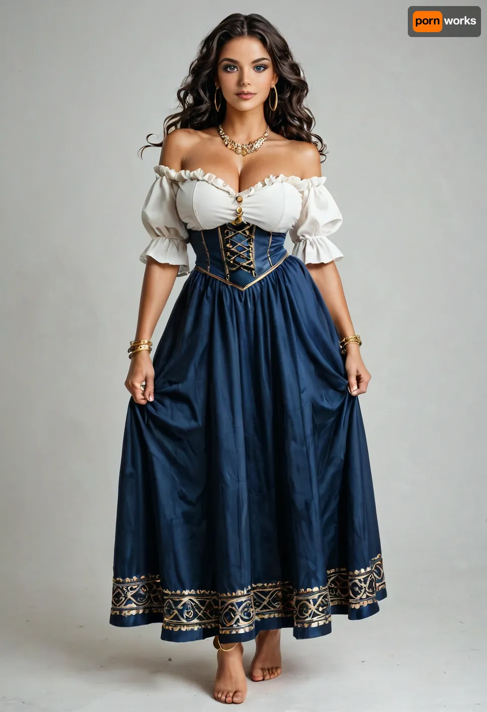 (Esmeralda from The Hunchback of Notre Dame), (large round breasts), (white, off-the-shoulder peasant blouse), (short and loose sleeves), (fitted corset-style bodice in teal blue with thin vertical gold lines), (deep purple, ankle-long and flowing layered skirt with white underskirt with a scalloped edge), (purple wrap around her waist with gold coin-like ornaments), (large gold hoop earrings), (gold bangles), (gold anklet around right ankle), (barefoot), France, (eye contact:1.2), (looking at viewer:1.2), (full body shot:1.3), (front view:1.4), most beautiful light-green eyes, perfect female face, gypsy female, beautiful female model, horny expression, beautiful, gorgeous, seductive eyes, perfect ass, (perfectly shaped breasts), (dynamic pose:1.3), warm colours, ((textured skin)), 4k epic detail, shot on kodak, 35mm photo, sharp focus, cinemascope, epic, score_9, score_8_up, score_7_up, rating, explicit, best quality, ultra-detailed, masterpiece, finely detail, highres, 8k wallpaper, intricate, highly detailed, insanely detailed, best lighting, perfect illumination, (best illumination), (best shadow, best shadows), full scene picture, full-length photo, ((ultra-detailed)), (intricate details:.6), professional photography, photo-realism, award winning photography, dslr, hyperrealistic, 35 mm, (Fujifilm XT3, analog style, professional DSLR photo, film grain:.8), 8k high definition, Great Composition, highly complex, (intricate detail:1.2)