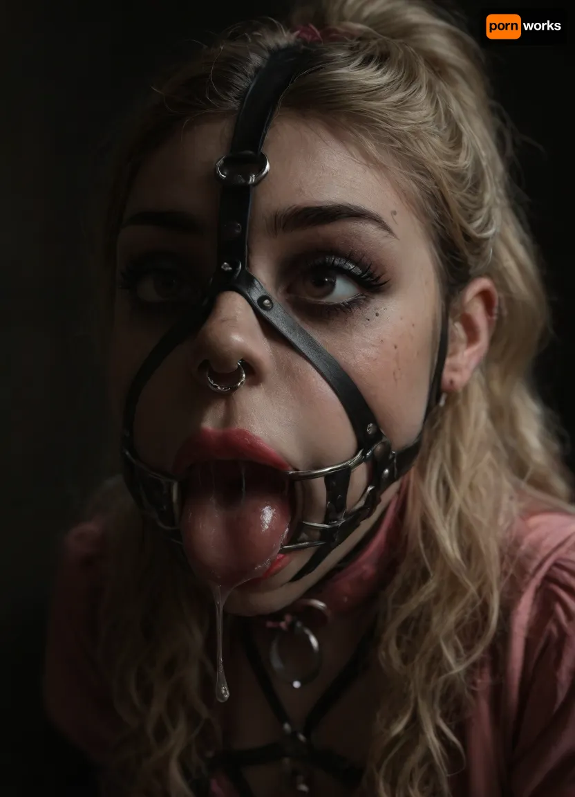 ((30 years old, Tipical italian girl, fit body, fake booobs, perfect cute face, scared, crying, curly very long blonde hair in ponytail, brown eyes, light freckles, bimpo lips, skin pores, smooth skin, round ass, hips gap, oiled body)), ((cute frilly pink dress)), ((heavy goth pink makeup, eyeshadow, eyeliner, mascara, red lipstick)), (pink slave collar), ((nose ring piercing, septum piercing:1.5)), ((pink face harness gagged mouth:1.5)), ((drooling saliva from mouth, lot of saliva)), in a country apartment, harnessgag, <lora:add-detail-xl:1.3>, <lora:detailed_notrigger:1.2>, <lora:dark:.8>, <lora:harnessgag_xl-000003:1.3> ((30 years old, Tipical italian girl, fit body, fake booobs, perfect cute face, scared, crying, curly very long blonde hair in ponytail, brown eyes, light freckles, bimpo lips, skin pores, smooth skin, round ass, hips gap, oiled body)), ((cute frilly pink dress)), ((heavy goth pink makeup, eyeshadow, eyeliner, mascara, red lipstick)), (pink slave collar), ((nose ring piercing, septum piercing:1.5)), ((pink face harness gagged mouth:1.5)), ((drooling saliva from mouth, lot of saliva)), in a country apartment, harnessgag, <lora:add-detail-xl:1.3>, <lora:detailed_notrigger:1.2>, <lora:dark:.8>, <lora:harnessgag_xl-000003:1.3>