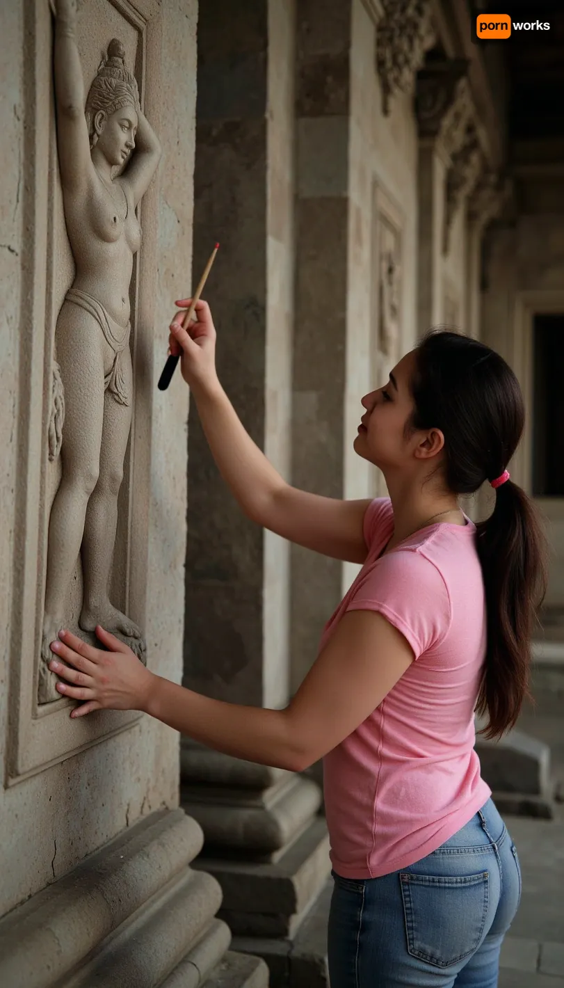 Photography Cinematic photography {Cambodian woman, 35-year-old restorer, with a brush in her hand, restoring a stone panel, (with the Hindu four-armed deity Vishnu), in the Angkor Wat temple complex}. 35mm photography, film, bokeh, professional, 4k, high detail, cinematic format, shallow depth of field, film grain, high budget, epic, mood