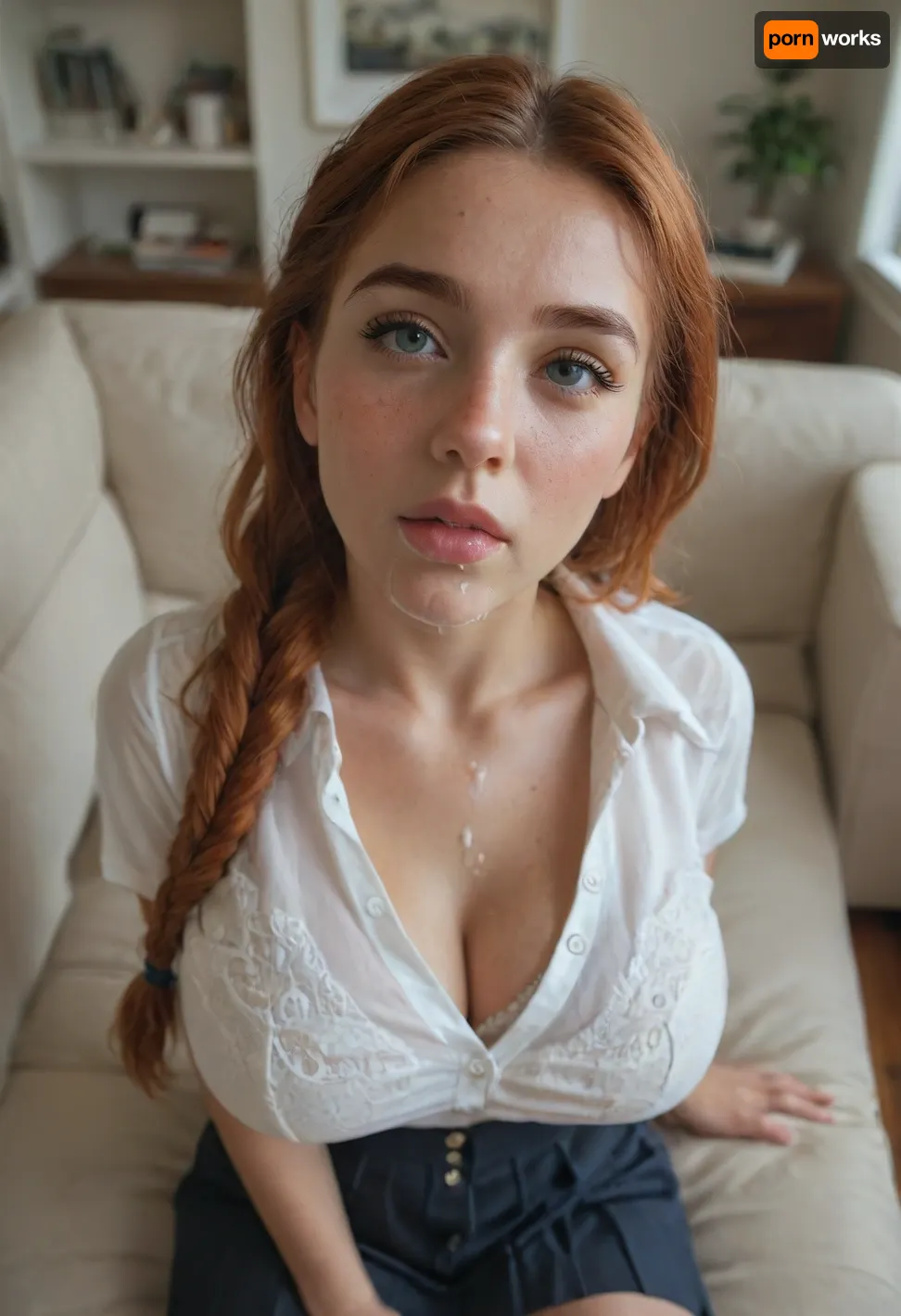 Living room, 18 yo girl, sitting on couch, very busty, looking up to viewer, she is very busty, she is insanely beautiful, freckles, irish, long ginger braided hair, (tight white school shirt), (bursting buttons), (big firm silicone breasts), (white bra showing a bit), pleated miniskirt, ((crying)), ((very close view from above)), ((front view from very high angle)), (very close focus on face and tits), ((tons of thick white cum on face and in mouth))