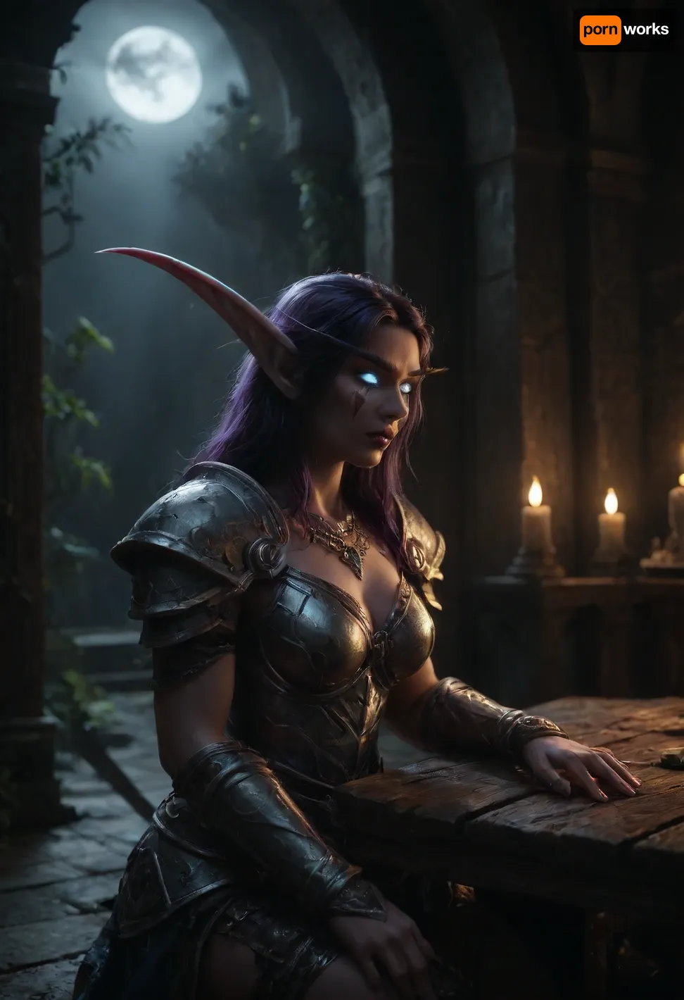 (Night elf woman, world of warcraft:1.3), dark clouds, forest floor, sitting, temple ruins, ruined temple setting, ivy hanging from walls, (fantasy sword standing aside), (ornate sword), ridged armor, oversized sword, ruined wood table, upper body, ruined pottery, purplehair, glowing blue eyes, heavily armored, heavy platemail armor, fantasy armor, jeweled armor, silver elven belt, ornate jeweled circlet, pale blue skin, <lora:dark:1>, <lora:darkfantasystyle:.8>, NEGATIVE_HANDS, cinematic, style, <lora:SDXL-World-of-Warcraft-cinematic-style-Lora-r32-000005:.8>, brazier, warm glow, glowing embers