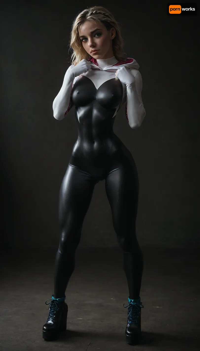 (((18 years old))), (((young))), (spider girl Gwen Stacy), Braided side Side Cornrows white Hair, (seductive shy face), (tied platform high shoes:1.4), (boots above the knee), (seductive sexy pose), ((tight outfit)), (athletic body:1.5), (athletic abs and legs:1.1), (hip gap:1.3), wide hips, (narrow waist:1.6), (white hair), (view from front:1.6), standing into the office, (makeup), ((pussy cameltoe:1.4)), (wet oiled clothes), (makeup:1.4), (oiled bodysuit:1.7), (wet tight bodysuit:1.8), hand, 1girl, (athletic ass), (high detailed face:1.5), dim lights, (hard nipples:1.2), big perky boobs, (chiaroscuro lighting:.3), <lora:HandFineTuning_XL:1>, <lora:MGLRbodysuit_sdxl:.6>, <lora:uberfit_lora_sdxl:.4>, <lora:dark:.3>, <lora:M0llY_PARK3R-000001:.8> (((18 years old))), (((young))), (spider girl Gwen Stacy), Braided side Side Cornrows white Hair, (seductive shy face), (tied platform high shoes:1.4), (boots above the knee), (seductive sexy pose), ((tight outfit)), (athletic body:1.5), (athletic abs and legs:1.1), (hip gap:1.3), wide hips, (narrow waist:1.6), (white hair), (view from front:1.6), standing into the office, (makeup), ((pussy cameltoe:1.4)), (wet oiled clothes), (makeup:1.4), (oiled bodysuit:1.7), (wet tight bodysuit:1.8), hand, 1girl, (athletic ass), (high detailed face:1.5), dim lights, (hard nipples:1.2), big perky boobs, (chiaroscuro lighting:.3), <lora:HandFineTuning_XL:1>, <lora:MGLRbodysuit_sdxl:.6>, <lora:uberfit_lora_sdxl:.4>, <lora:dark:.3>, <lora:M0llY_PARK3R-000001:.8>