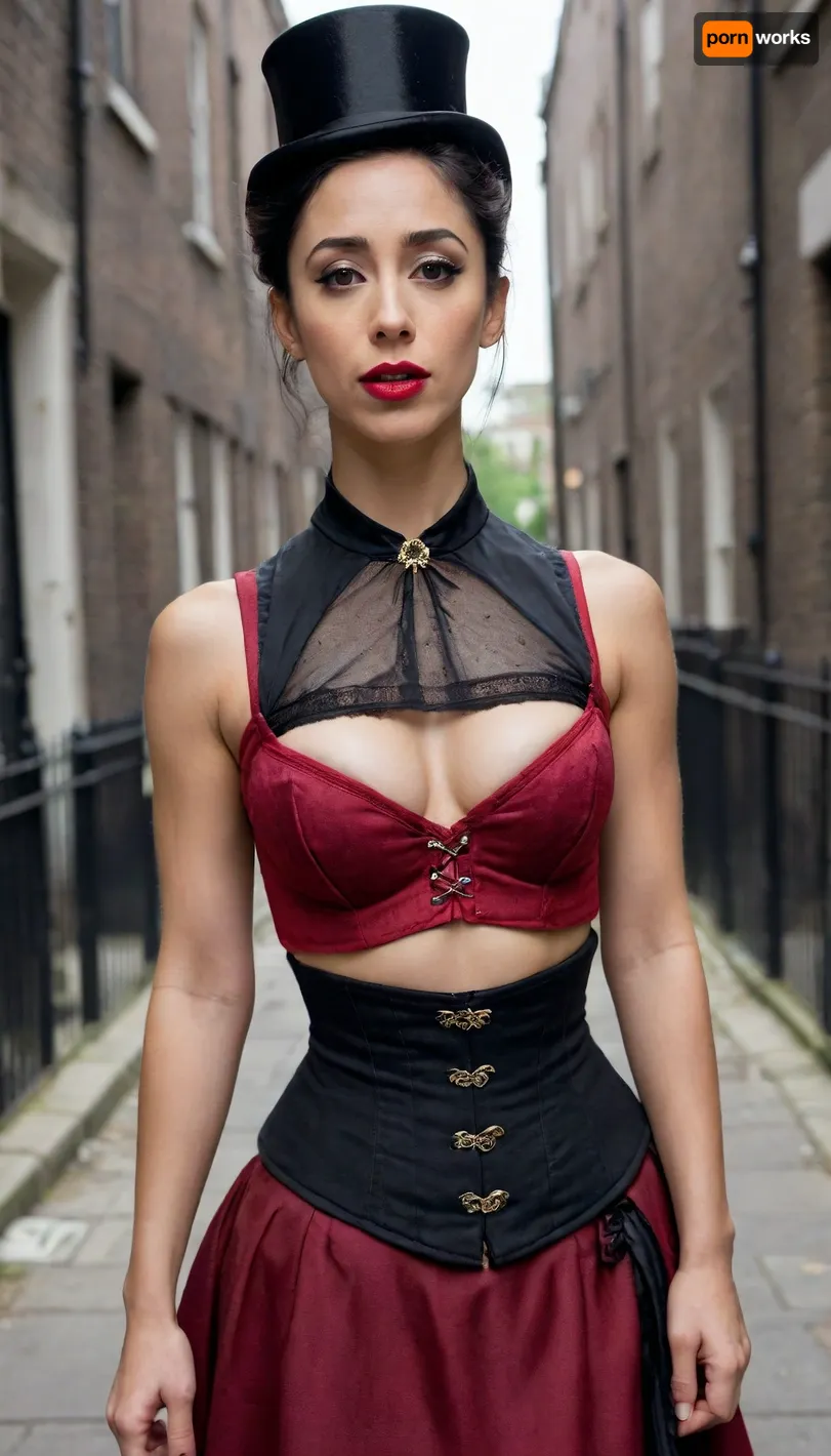 39 year old Oona Chaplin, (Olive Skin), freakles face and chest, English-Spanish Citizenship, her jet black hair in a ponytail, her jet black eyes brows, dark eyeliner, bright red lipstick, 34C chest, muscular body, six pack, cameltoe pussy, with a Lady's Victorian Top Hat with vail behind it, wearing Steam Punk Victorian costume, Victorian Corset under her breasts, the skirt opened at the front showing her triangle bushy pubic haired pussy, standing on the abandoned streets of Victorian London.