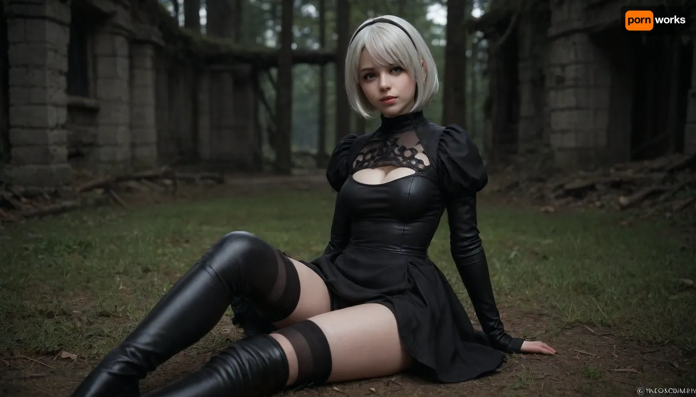 ((2B, YoRHa, NieR, nier automata)), 4K resolution, full-length, sitting, (1 girl), beautiful, cute, pale skin, detailed image, realistic face, smile, slender figure, anime style, subdued lighting, soft light, looking at viewer, forest edge, ruins overgrown with grass, black dress in Gothic style, black thigh-high stockings, long leather thigh-high boots, pussy visible from under the skirt, detailed pussy, anatomical pussy, perfect pussy, <lora:2b_nier_automata:2>