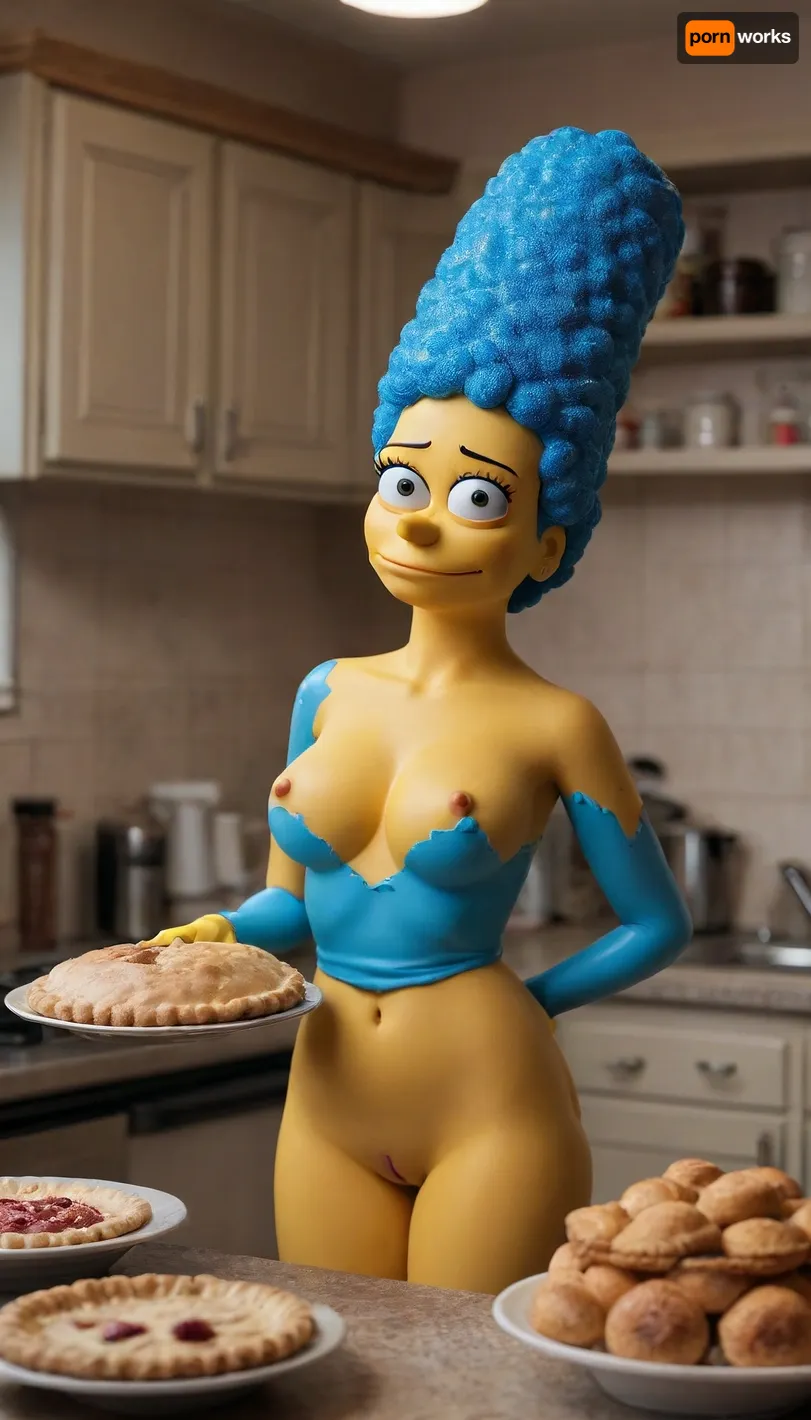 Marge Simpson stands naked in her kitchen baking pies. Marge Simpson stands naked in her kitchen baking pies.