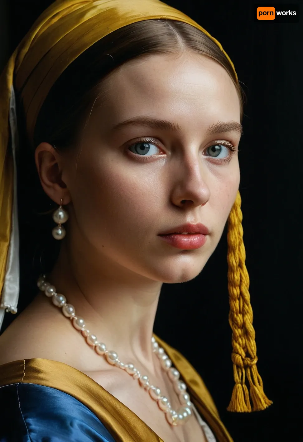 Girl with a Pearl Earring painting by Dutch artist Jan Vermeer. Super clear, highly detailed watercolor, glaze technique, plus colored alcohol ink, style of Dutch artist Jan Vermeer, rope, black, tape, gag, bondage, <lora:bdsm_SDXL_1_:.8>