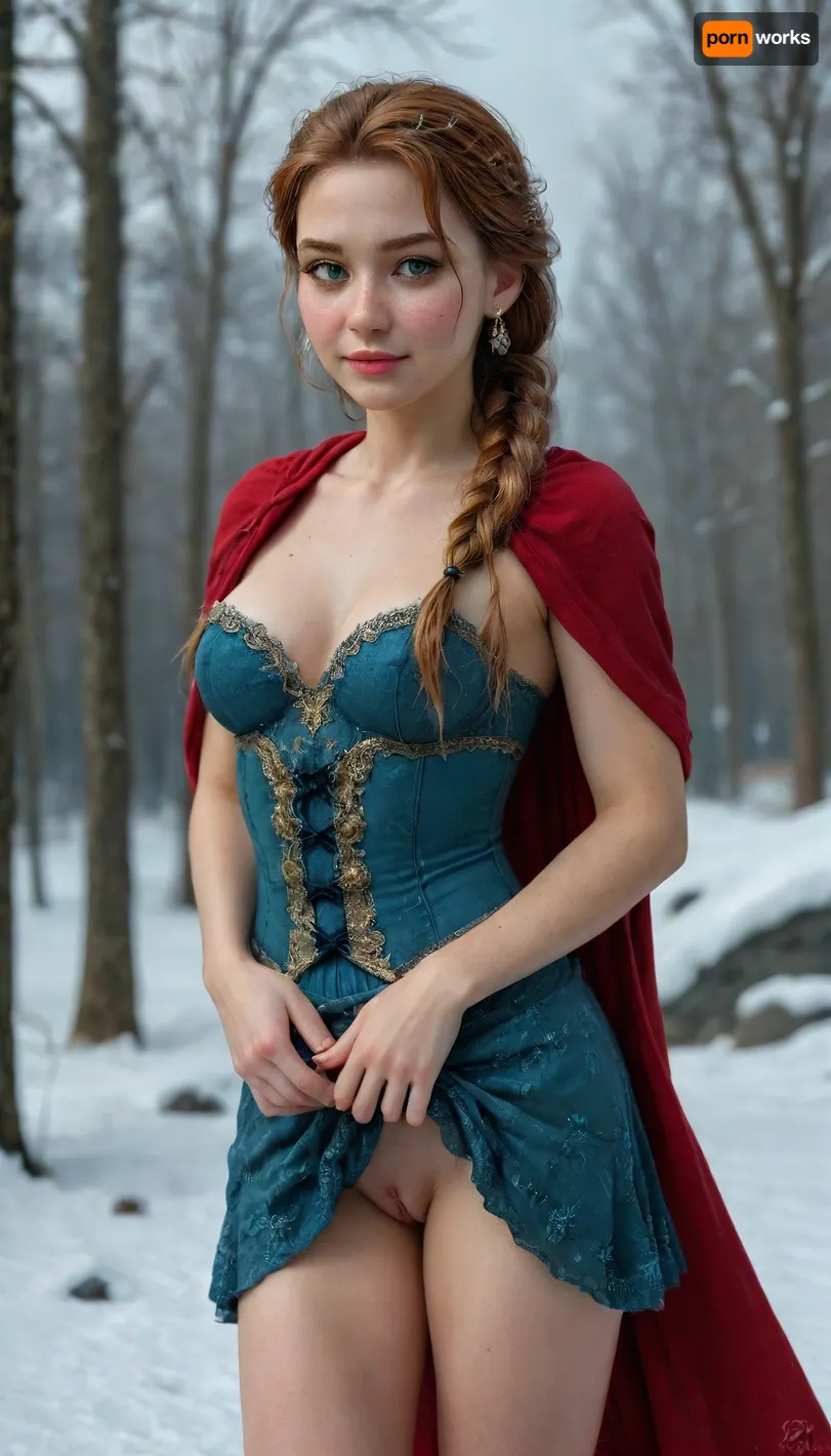 (masterpiece, best quality, highres, photorealistic), 18-year-old girl inspired by Anna from Frozen, sexy fantasy reimagining, petite and fit figure with soft pale skin, short tight-waisted corset in royal navy and gold embroidery barely covering her full perky breasts, erect nipples visible through the thin fabric, revealing deep cleavage framed by the corset lines, wearing a sheer teal skirt split open to both sides, exposing her smooth bare legs and crotch, shaved and glistening pussy visible beneath the flowing translucent fabric, pink labia subtly outlined, tight and neat anus centered and clean, loose dark rose-red cape draped behind her shoulders, small snowflakes glistening on the fabric, thin black gloves pushed halfway down her arms, her soft red-auburn hair tied in two playful braids falling over her chest, loose strands framing her youthful, flushed face, glowing green eyes wide and expressive, long lashes, glossy pink parted lips, gently blushing cheeks, seductive smile, standing with one foot slightly forward in snow-covered forest ruins, her hand lifting the front of her split skirt, head turned slightly toward viewer, background glowing with enchanted blue mist, shimmering frosty trees, and icy crystalline arches catching ambient moonlight, snowflakes caught in her lashes and braids, cold breath softly visible, soft magical lighting, ultra-fine texture on snow, cloth and skin, (ultra-detailed face and eyes:1.2), HDR, realistic anatomy, no distortions, (detailed enchanted snow background:1.3), <lora:PerfectEyesXL:1>, <lora:add-detail-xl:.8>, <lora:detailed_notrigger:.8>