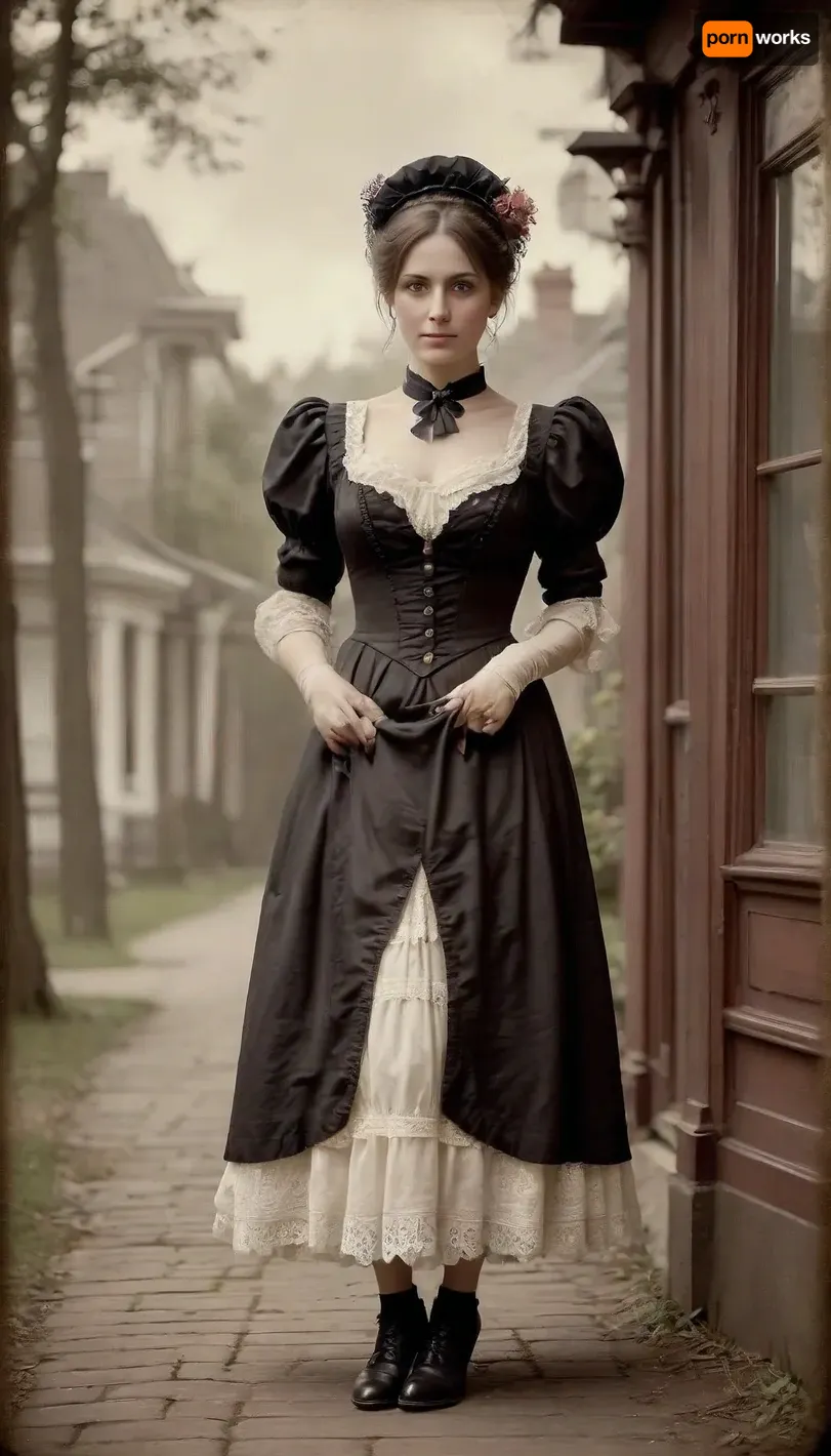 (attractive woman:1.3), (45 years old:1.6), (long dress:1.1), pretty victorian lady, (panties down:1.3), outdoor, ((19th century vintage Victorian photography:1.5), tintype, dry plate, grainy, real, (facing camera:1.2)), (skirtlift:.03), J.C., Leyendecker, Style, page, <lora:skirtlift_xl:.03>, <lora:J.C. Leyendecker Style:.5>