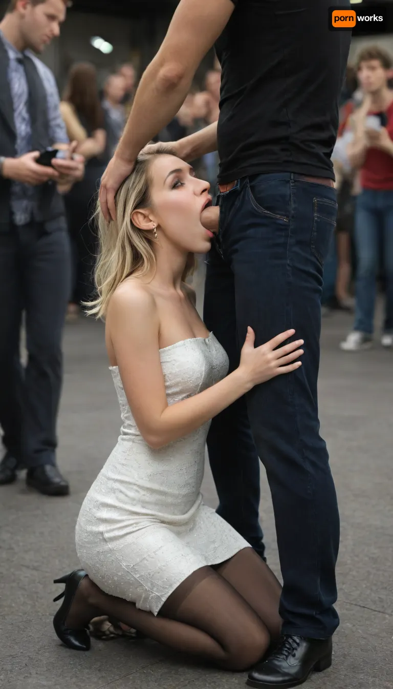 Club dance floor, female escort, female closed eyes, People view, audience in party clothes, male next to female, 18 year old female, hand on head, blonde hair, annoyed female, black pantyhose, full body, kneeling, strapless, tube, dress, bodycon, shocked, nonplussed, unzipping his pants, unzipping his trousers, beautiful, detailed face, nice big dick, ready for blowjob, licking, dick deep in mouth, deepthroat, pushing head, gagging, giving handjob to another man, <lora:Plain_tube_dress:.8>, <lora:shocked:.8>, <lora:crowd_notrigger:.8>