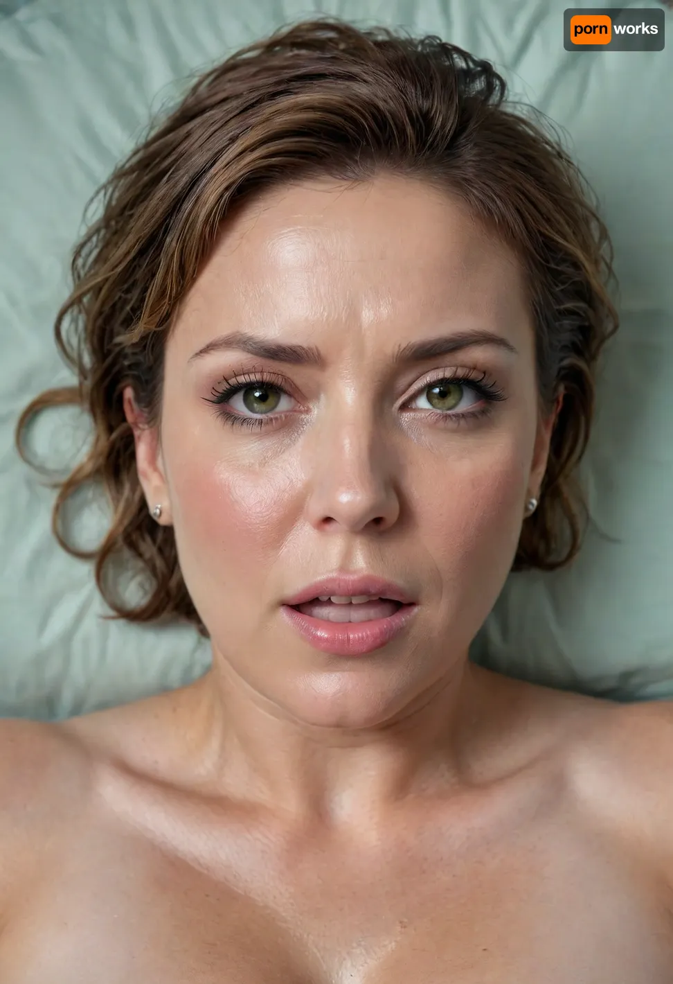 Bbw Milf, RAW photo, subject, (high detailed skin:1.1), 8k uhd, soft lighting, high quality, film grain, Fujifilm XT3, ((curvy woman)), excited nude thin 45yo mature women, ((voluminous chestnut updo haircut)), in cluttered dorm bedroom, naked waist, orgasm face, half body shot, masturbating, unfocused gaze, open mouth, furrowed brow, looking at viewer, lying flat on her back in bed, aerial view, shot from ceiling, damp sweaty skin, (4K UHD ultra-detailed RAW photo), high detailed, 8k, (photorealistic:1.7), <lora:rknArouseXL:.8>, green, eyes, blue, perfecteyes, <lora:PerfectEyesXL:.8>