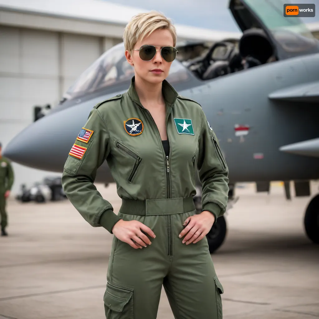 Military airport garage scenery, full-body shot, test pilot before her first flight, blonde straight pixie hair, wearing advanced green military flight suit with large cleacage and classic aviator sunglasses, big boobs, outdoors, standing in front of a prototype F 15 Eagle, masterpiece, photorealistic, high-detail, high quality hands Military airport garage scenery, full-body shot, test pilot before her first flight, blonde straight pixie hair, wearing advanced green military flight suit with large cleacage and classic aviator sunglasses, big boobs, outdoors, standing in front of a prototype F 15 Eagle, masterpiece, photorealistic, high-detail, high quality hands
