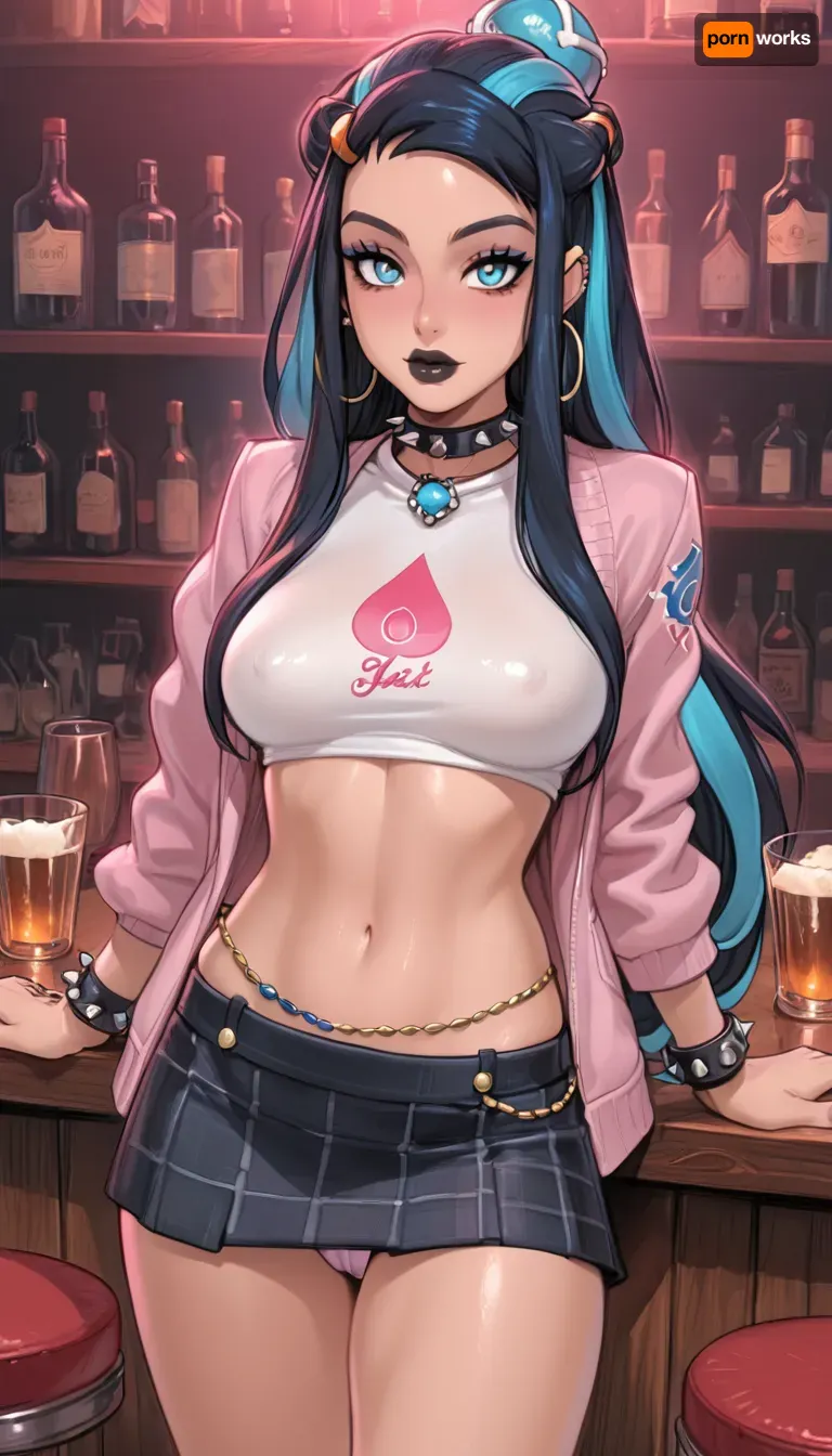 (reiq style), (nessa from pokemon:1.6), 18 years old girl, covered in tattoos, lots of tattoos, pink crop top jacket, white micro bra, queen of spades branded panties, short plaid skirt, (camel toe), detailed blue eyes, (glamorous goth makeup, black lipstick), spiked choker, spiked bracelets, long eyelashes, (high cheekbones:1.4), perfect nose, (full plump lips:1.2), (bar country:1.6), curvy, 1 girl, beautiful eyes, Melkor Mancin artstyle, score_9, score_8_up, score_7_up, (genshin, impact\), TattooVariations, 3m0, Punk, G1rl, girl, portrait, makeup, glowing, punk, <lora:cartoon_stickers_xl_v1:.8>, <lora:ratatatat74-000050:1.3>, <lora:DetailedEyes_V3:2>, <lora:TattooVariations:1.9>, <lora:Emo_Punk_Girl:1.2>