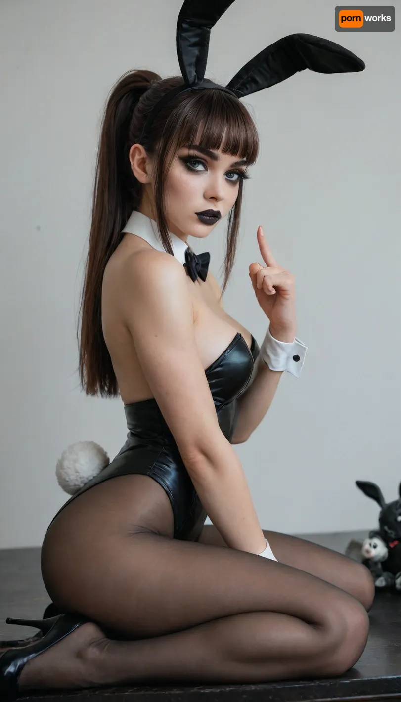 (Brunette girl:1.3), (gothic makeup:1.3), (Solo), (detailed natural hand finger:1.3), long black ponytail hair, ((fringe hair)), ((big black eyes)), ((black lips)), ((medium breast)), ((black thick eyelash)), ((black thick eyebrow)), ((black thick eyeliner)), bunny suit, rabbit tail, shiny black leotard, Sleek bunny ears headband, Detachable collar with bow tie, Signature cuffs with cufflinks, Plush bunny tail, pantyhose, black high heels, score_9, score_8_up, score_7_up, white background, full body back side view, sitting down table