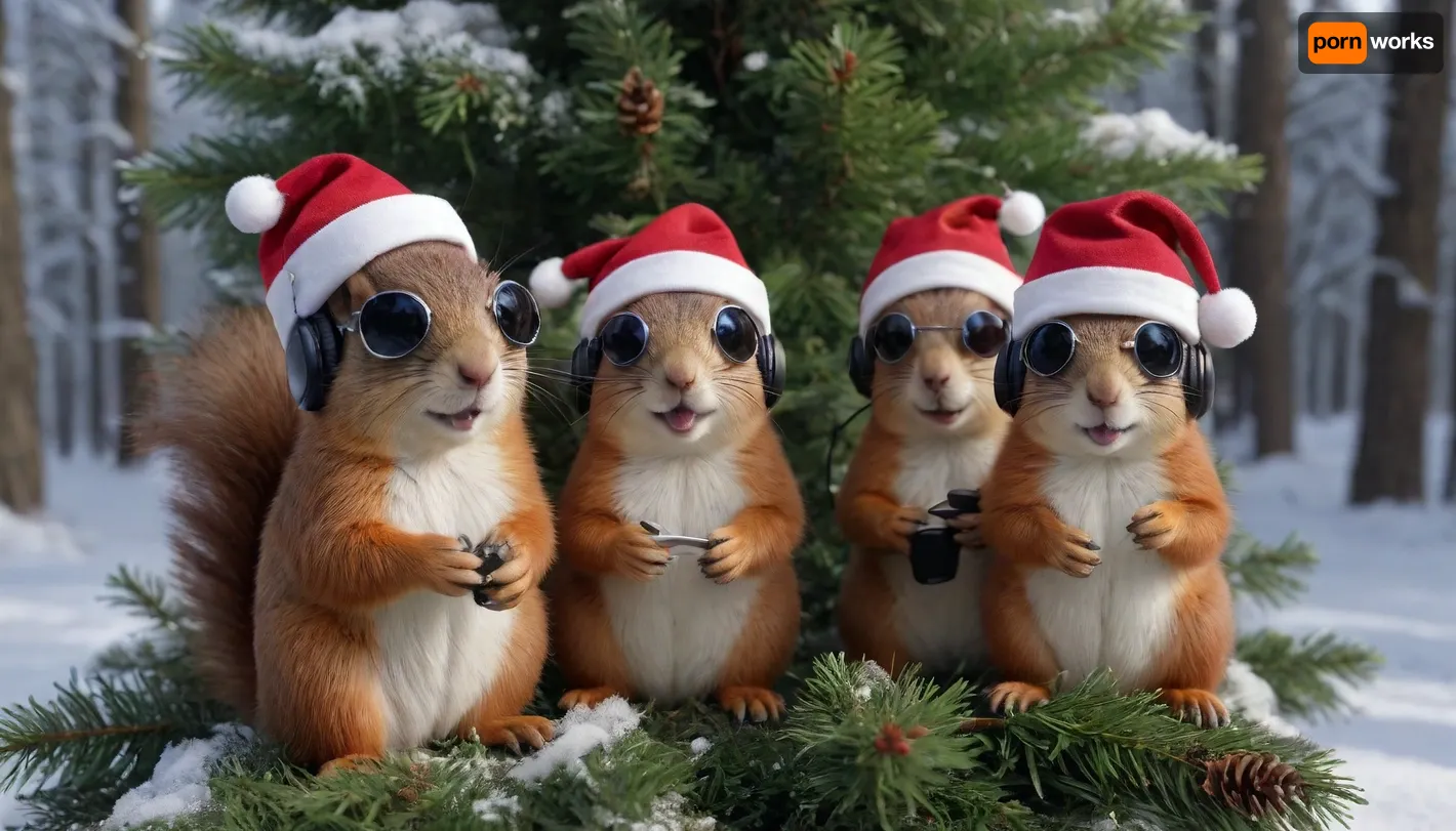 Five Singing squirrels wearing sunglasses and headphones, santa cap, sitting in Christmas tree, forest, snowing, christmas bauble, sharp focus, photorealistic, hyperrealistic, high resolution, very detailed, best quality Five Singing squirrels wearing sunglasses and headphones, santa cap, sitting in Christmas tree, forest, snowing, christmas bauble, sharp focus, photorealistic, hyperrealistic, high resolution, very detailed, best quality