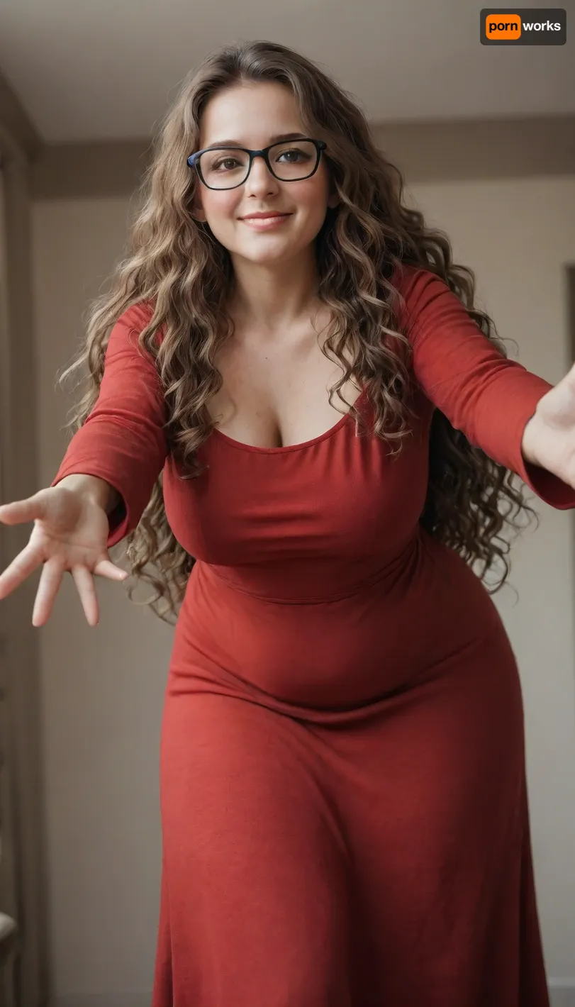 (25 middle years:2), (white Woman), (very white skin), (A single woman:1.5), (brown eyes:1.6), (ultra-realistic), (best quality), (best lighting), (fat body:1), (wavy hair:1.4), (long hair:1.4), (brown hair:1.4), (big breast:1), (wide hip:1.2), (big ass:1), (big thigh:1.2), (blush:1.3), (slight smile), Chubby belly, (thin glasses), (black glasses), (long dress:2), (red dress:2), (red long sleeves:1.5), (view from below:1.4), (Leaning forward:1.4), (Reaching out:1.5)